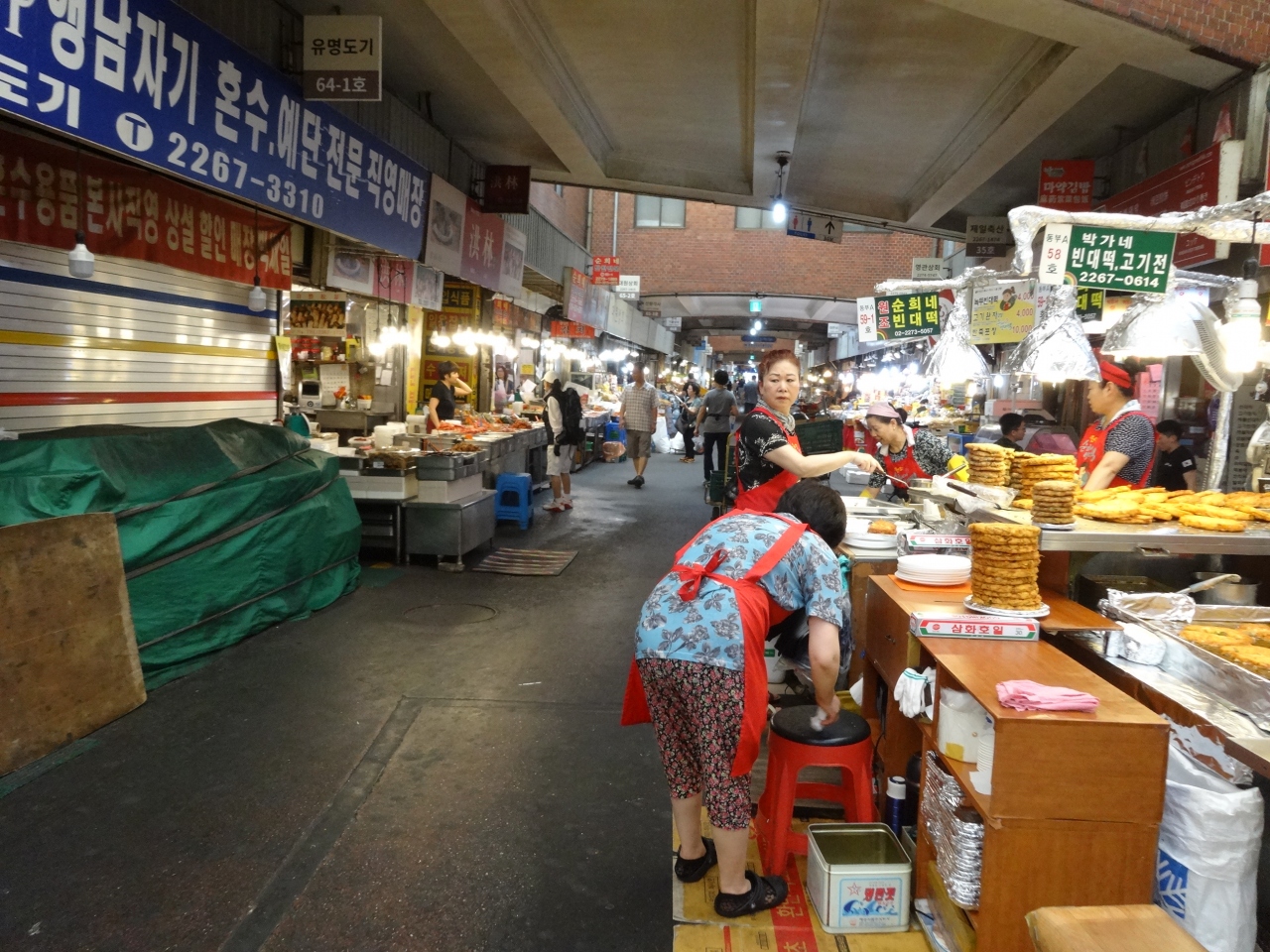地下鉄の鍾路5街駅や乙支路4街駅のすぐ近くです。南大門市場ほどではありませんが、市場全体が大きな屋根に覆われており、結構広い市場でした。