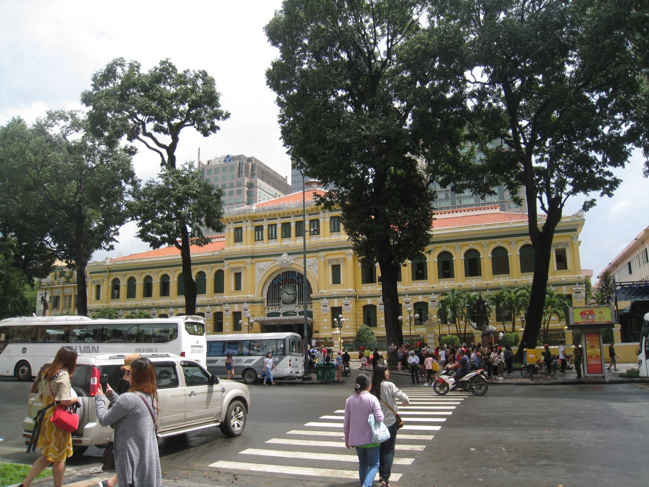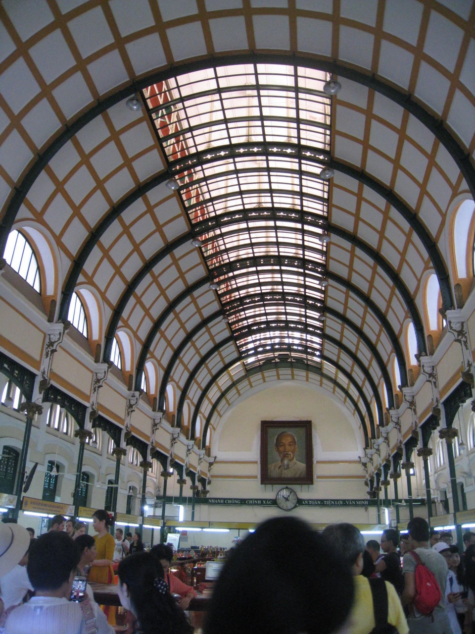 フランス統治時代の建物ということもあり、フランスの駅舎や美術館のような外観と内装です。特に天井が印象的で、壁には植民地時代のサイゴンの地図もあり、見どころは多くありますね。ただ、中央と両サイドにあるお土産物屋はちょっと雰囲気を壊すかなぁと。
