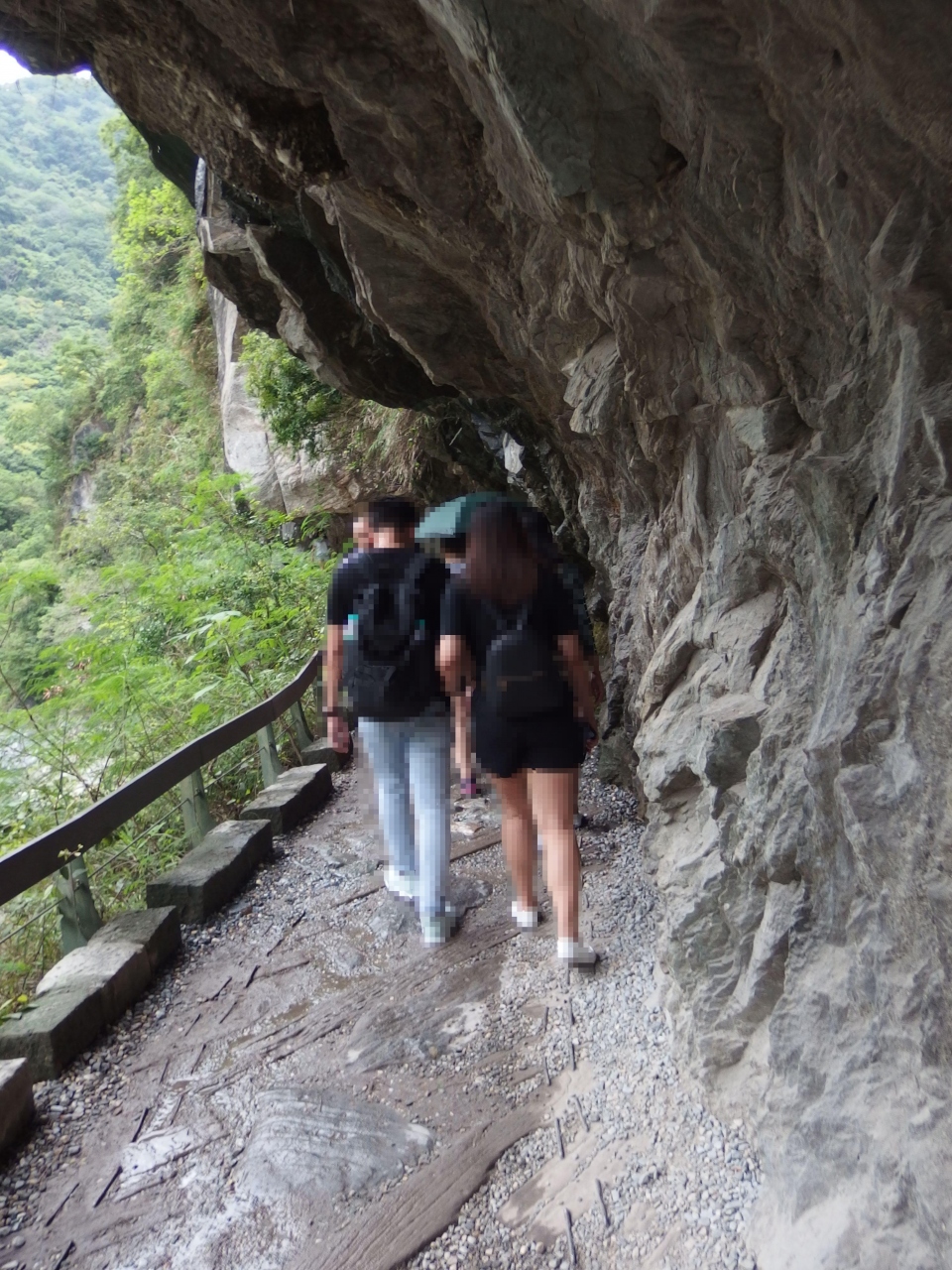 太魯閣一日ツアーの最後に組み入れられていました。駐車場からいろんな表情の大理石の獅子像を見ながら橋を渡り、大理石でできたゲートをくぐって橋の下に長い階段を下りてやっとスタート地点です。歩道は崖沿いを清流を見ながら歩きますが、途中岩をくりぬいた半トンネル状のところがあったりと太魯閣らしさが感じられます。