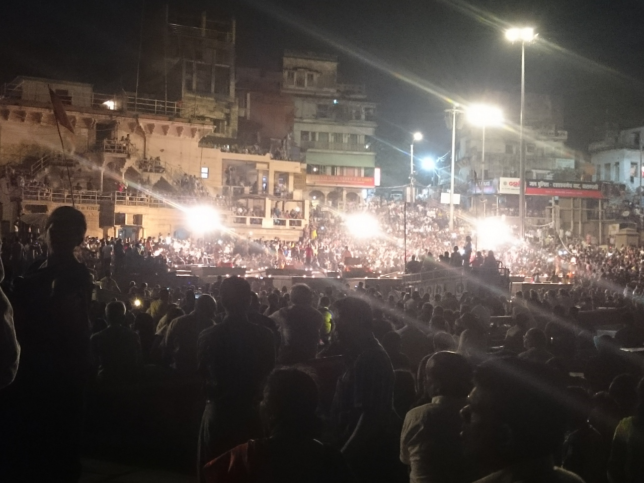 ボートに乗って、ガンジス川側から、夜のダシャーシュワメードガートの大規模なプージャを見学しました。