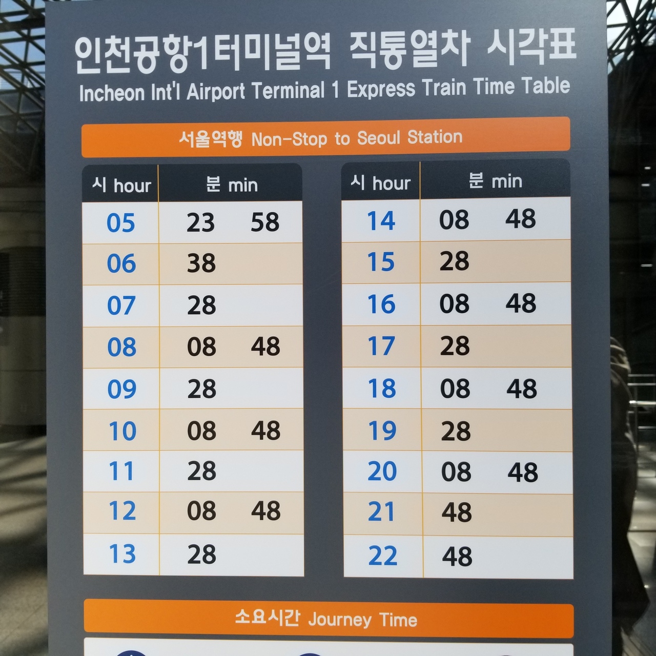 43分で到着することができます。直通列車は9,000ウオンですが空港のチケットセンターにてJCBカードを利用すると割引がききます。飛行機の移動で疲れた時に最適な移動手段です。