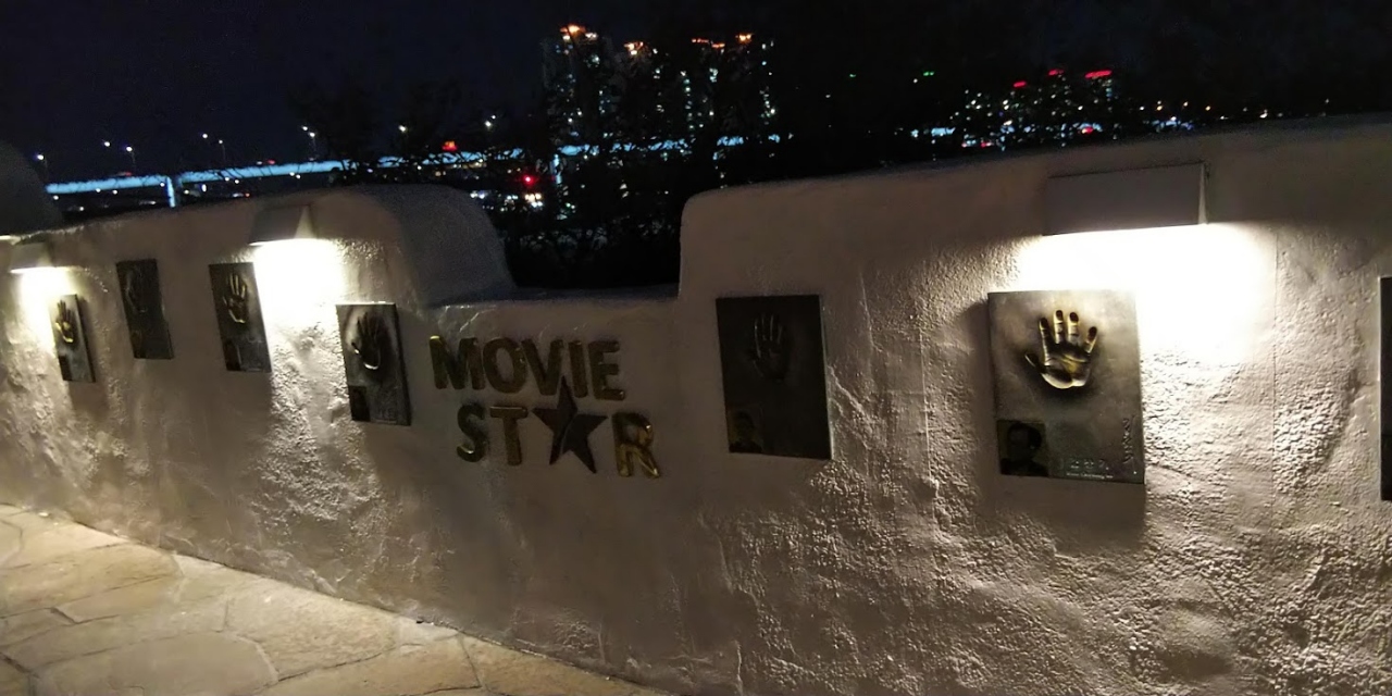 プサンシティツアーバスの夜景コースに参加した時に、予定とは別にこちらのスポットに停車して、見学することが出来ました。映画の関連オブジェや手形などがあって、ちょっとした公園のような感じになっています。すぐ目の前が海で、広安大橋が見えます。自分が立ち寄った時は夜でしたが、ライトアップされた橋とこちらのスポットの街灯の光と良い風景をつくりあげている感じでした。お洒落なスポットです。手形はBIFF広場にあるよう手形ですが、BIFF広場のように地面に埋め込まれているのではなく。壁に埋め込まれており、擦り減らないようになっています。