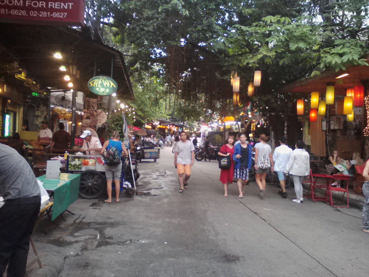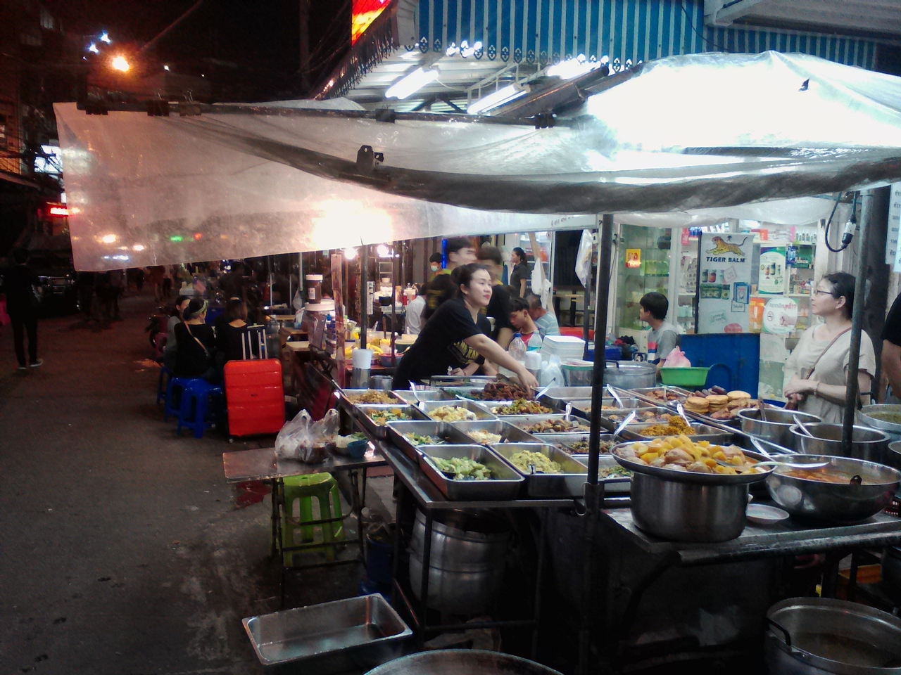 カオサン通りの1本北側の通り。この通りにもレストランや土産物屋、マッサージ店などが並んでおりカオサン通りの騒々しさを逃れた旅行者で賑わっています。夕方になると屋台も出ます。東側の入口付近(セブンイレブン側)にはその場で食事ができる屋台もあります。おかずの入ったバットがいくつも並んでいるのが目印、指を差すだけで注文できてしまいます。ご飯におかずを乗っけてもらい、おかず1種類だと35B、2種類だと45Bです。カオサンエリアだけにちょっと高いですが1人で簡単に夕食を済ませたい時には重宝すると思います。