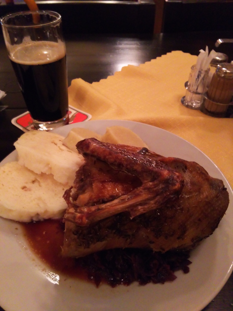 黒ビールと、ガッツリお肉のダック、スープを注文して1100円位。