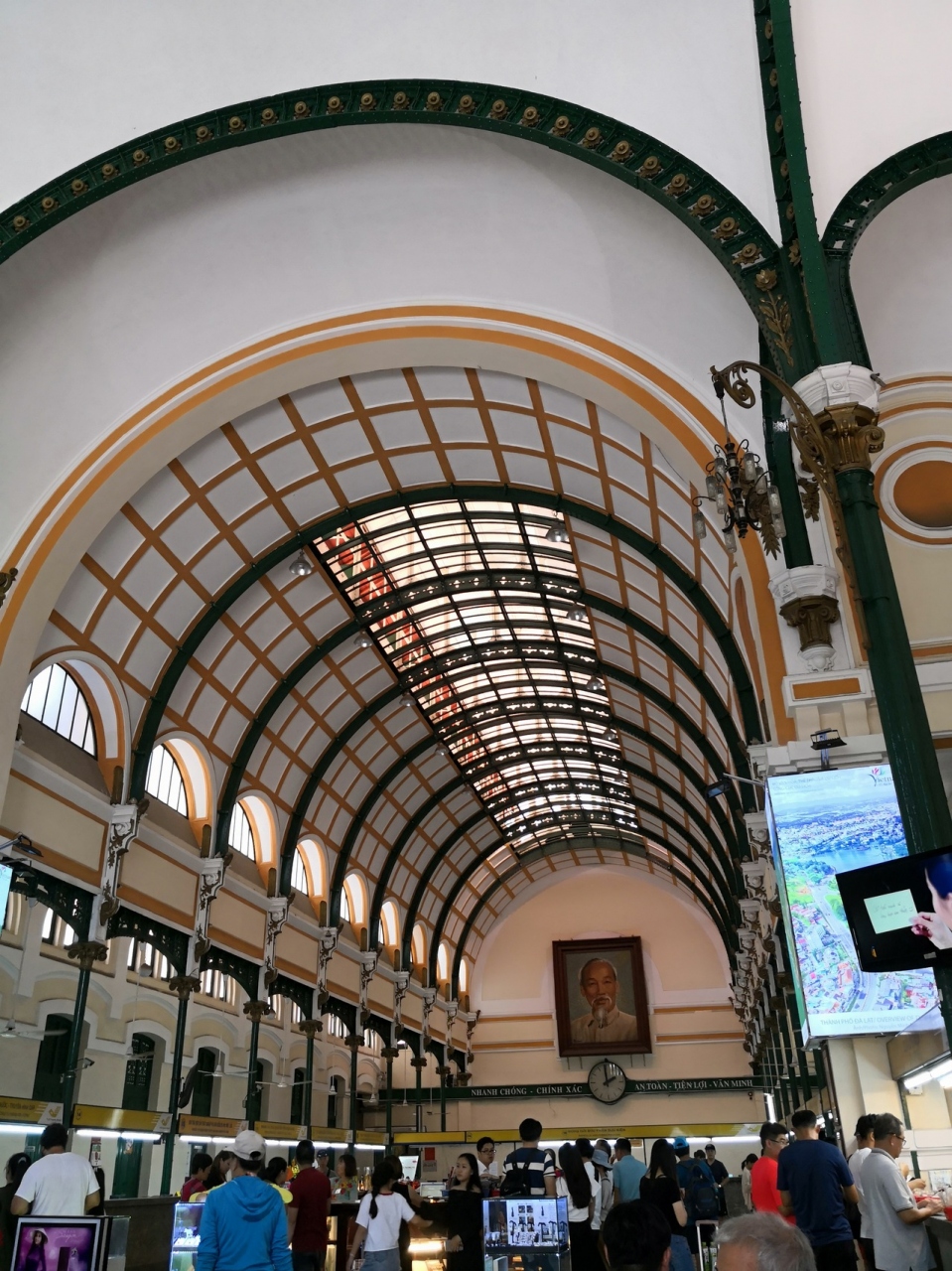 サイゴンこと、ホーチミンシティに来たら必ず行く中央郵便局には、入ると正面に大きなホーチミンさんの肖像画が有ります。現役で使われている郵便局は、日本にお手紙も出せます。色々なお土産も揃ってて、椅子もあるので休むことも出来ます。