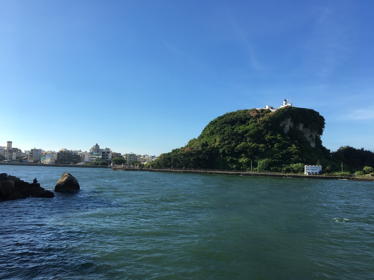 高雄港に入港や出港する船が、狭い海峡を横断する様子はなかなかです。旗津灯台側と西子湾側の両方に大きな標識が立っていました。西子湾の先に展望所があり、そこから見ると、手の届くようなところを大型船が通る様はとても面白いです。