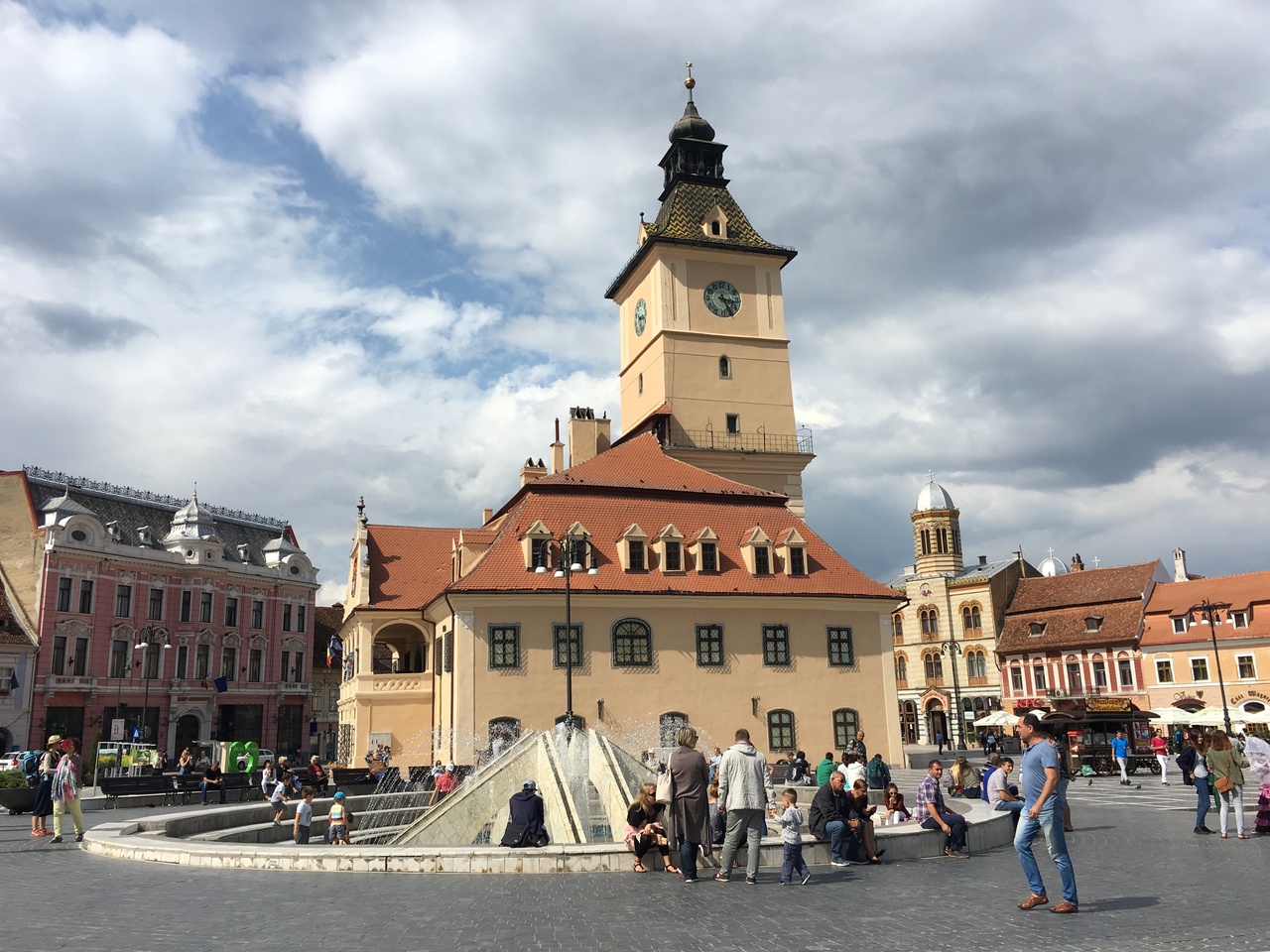 ブラショフ旧市街地の中心にあるスファトゥルイ広場。周囲には旧市庁舎や黒い教会などの主要観光スポットに加えて土産物屋やレストランもあり、昼夜問わずたくさんの人々が賑わっています。