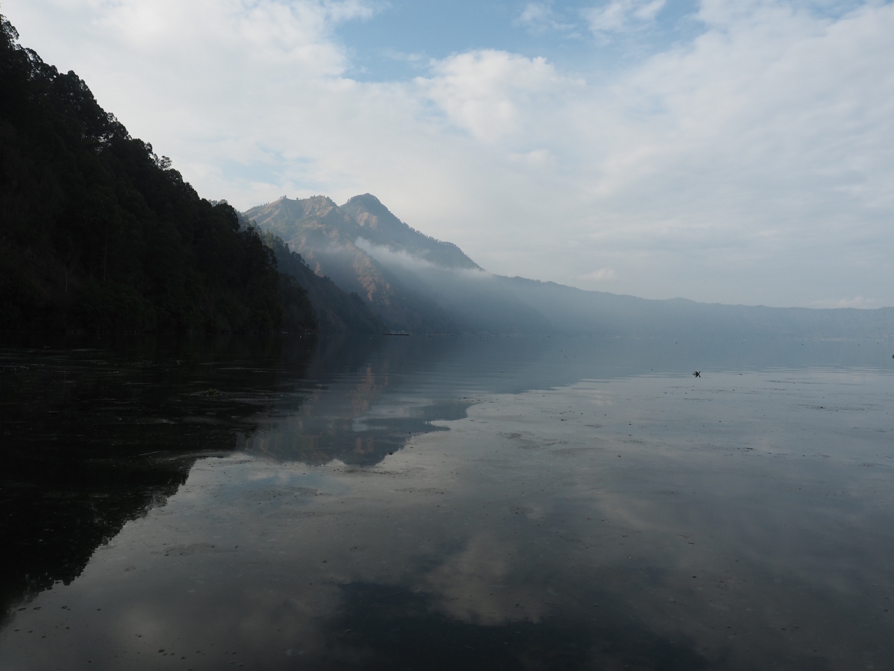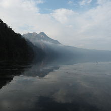 ボートで湖を渡りました。ちょうど靄のような霧のようなものが少し出ていて、バリ・アガの村があるよと言われた方にかかり、すごく神秘的な雰囲気でよかったです。湖面が鏡のようになって周辺の山々を映し出していました。