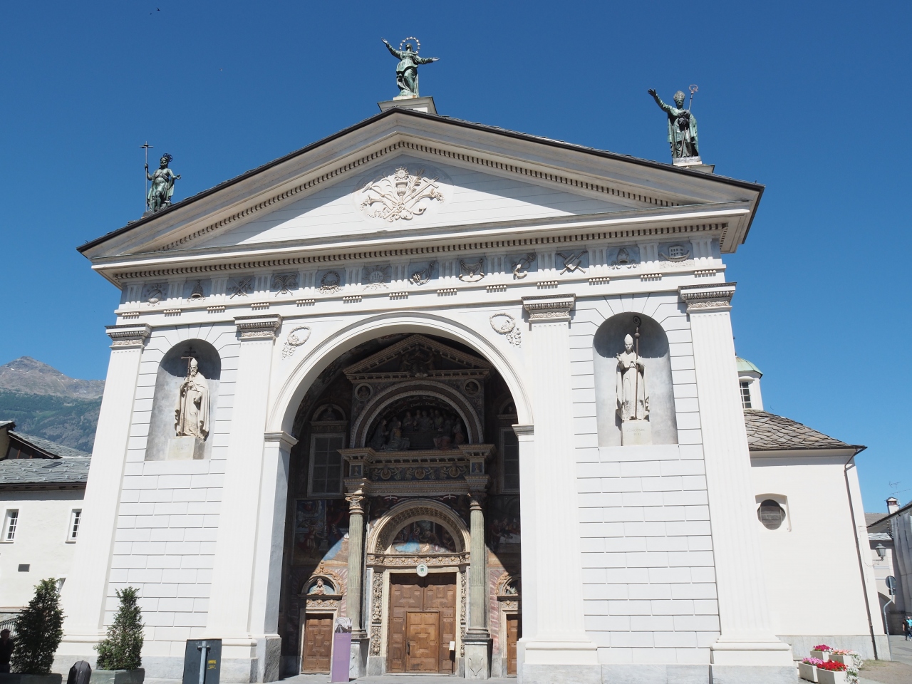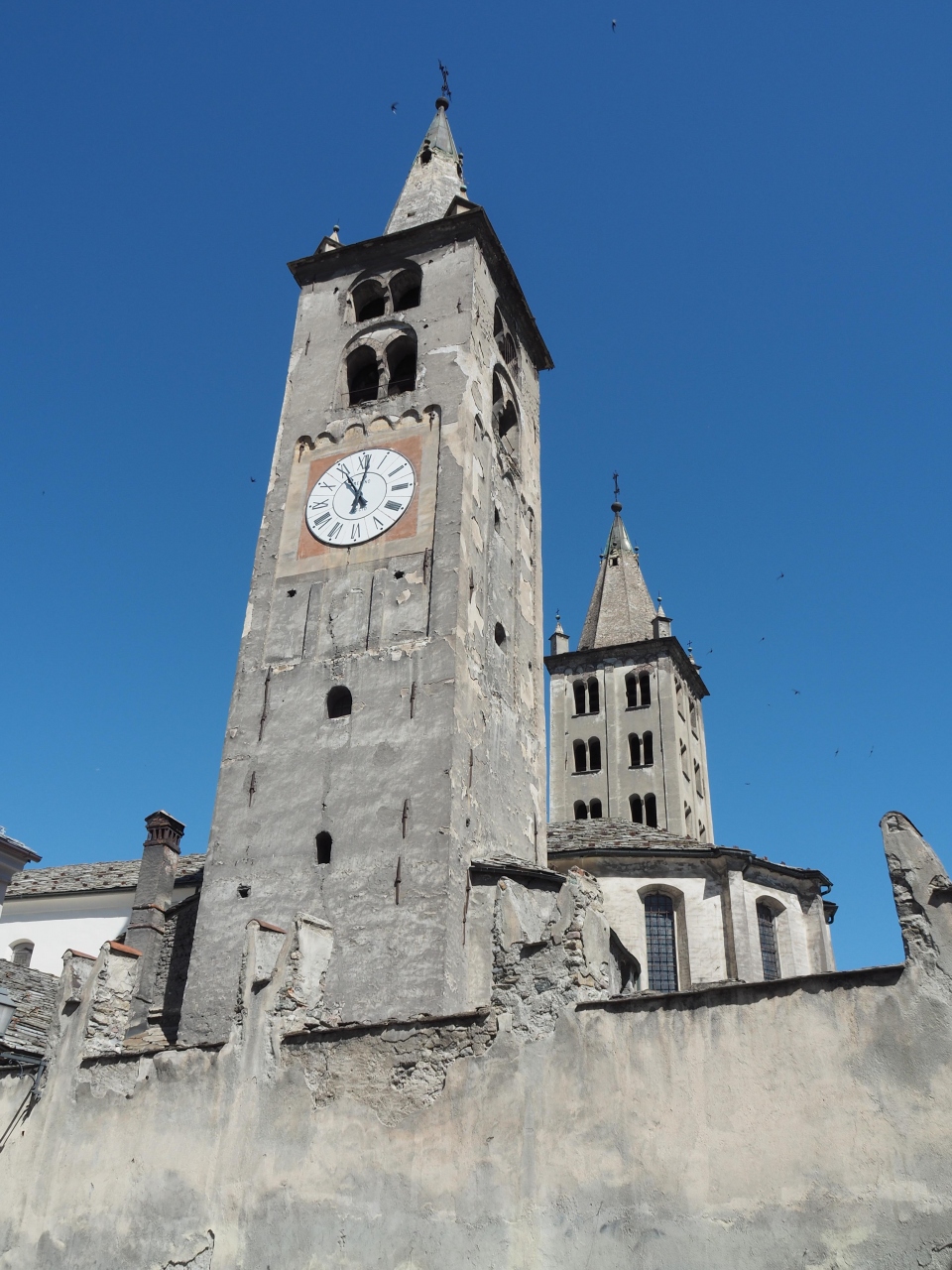 アオスタ駅を背に歩くと、市庁舎の裏手に大きな時計塔のある大聖堂の鐘楼が見えてきます。