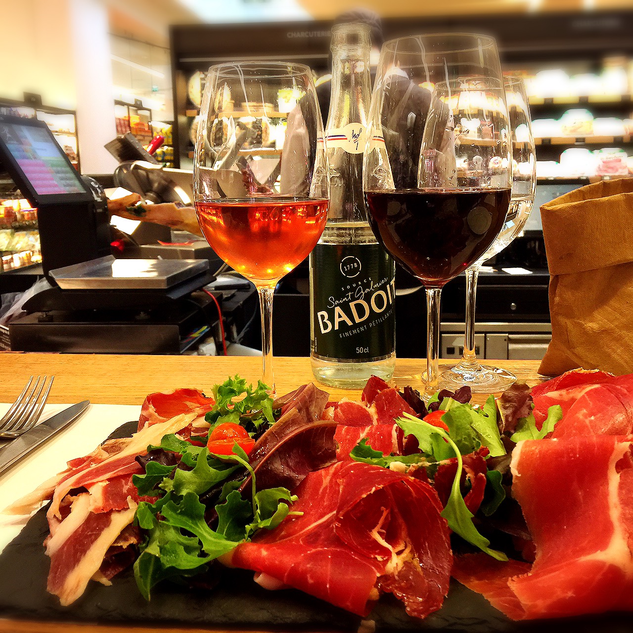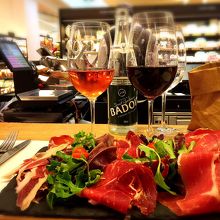 パリを代表する高級スーパー。歩き疲れたら休める場所がたくさんあります。中でも吊り下げられた生ハムが目を惹くこちらのカウンターで切りたてのハム盛り合わせやワインバー並みの品揃えがあるフランスワインのテイスティングを愉しまれてはいかがでしょうか?