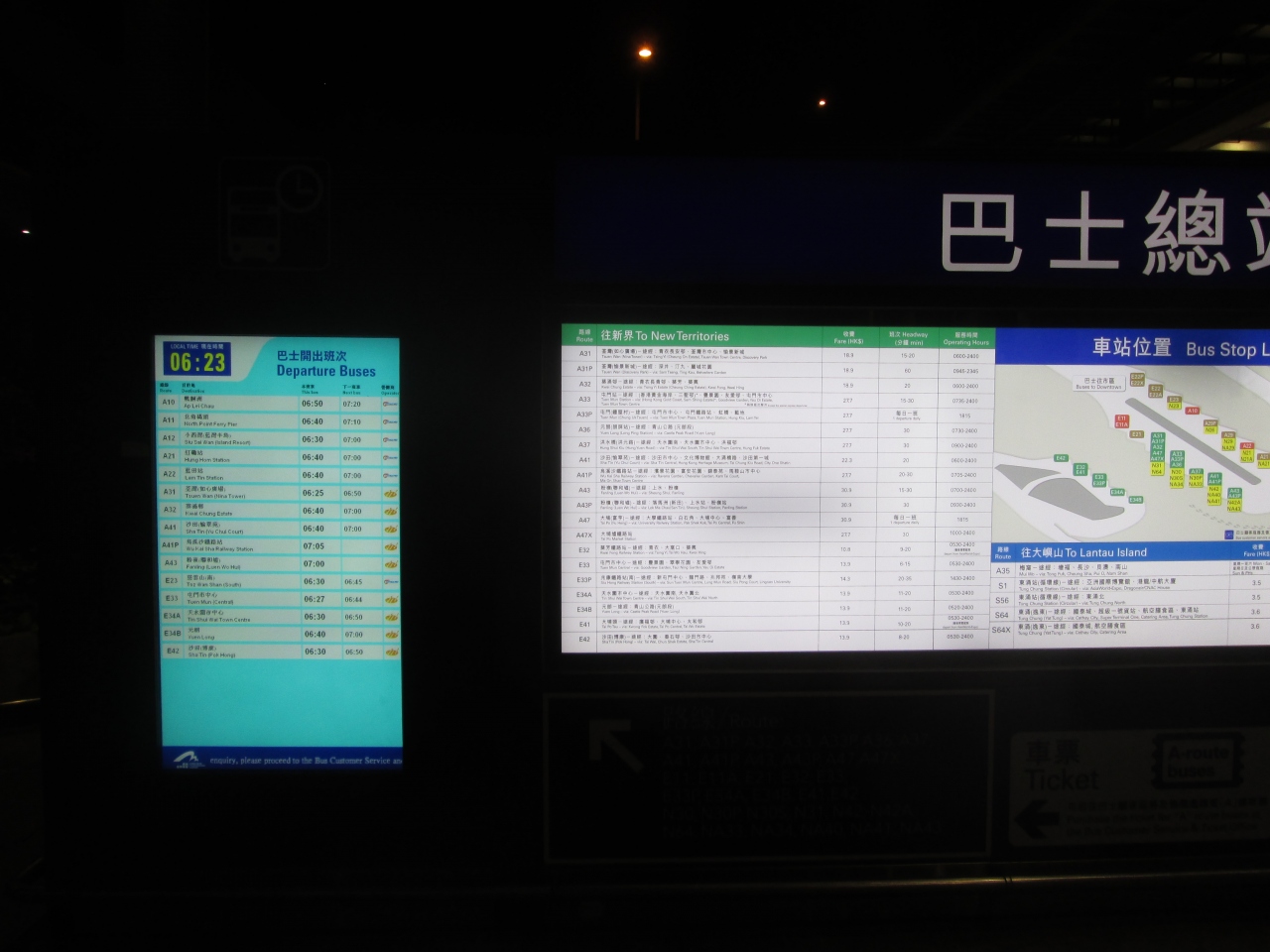 早朝の時間帯にA21の空港バスを利用しました。香港の入国審査を終えてバスターミナルに到着したのが、朝6時30分過ぎ。6時台は香港中心部に向かうどの路線のバスも運行していました。さすがに、朝早い時間帯は香港名物の渋滞にも捕まることなく、45分程度の所要時間で移動できました。