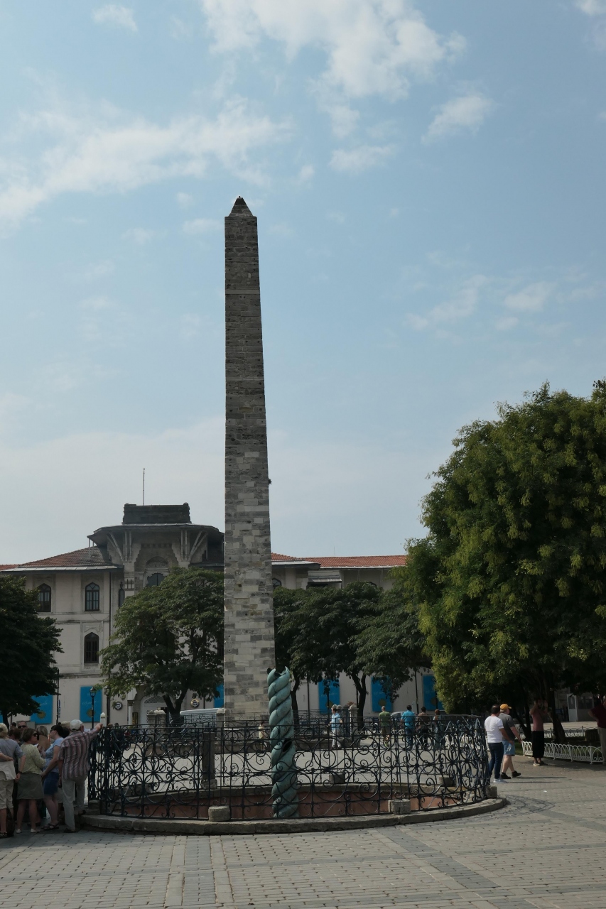 広場ヒッポドロームにある2本のオベリスクの中の一つが、コンスタンティヌス7世のオベリスクです。石積で構成されたオベリスクで、高さは32mで隣のテオドシウス1世のオベリスクより6m程高いオベリスクです。このオベリスクが建てられた年は不明ですが、10世紀にオベリスクを大々的に修理したコンスタンティヌス7世の名称が付けられています。オベリスクを観光客が取り囲み、ガイドが説明していました。言葉が分かりませんので内容は不明ですが、イスタンブールの支配者歴史に関する内容だろうと想像しました。