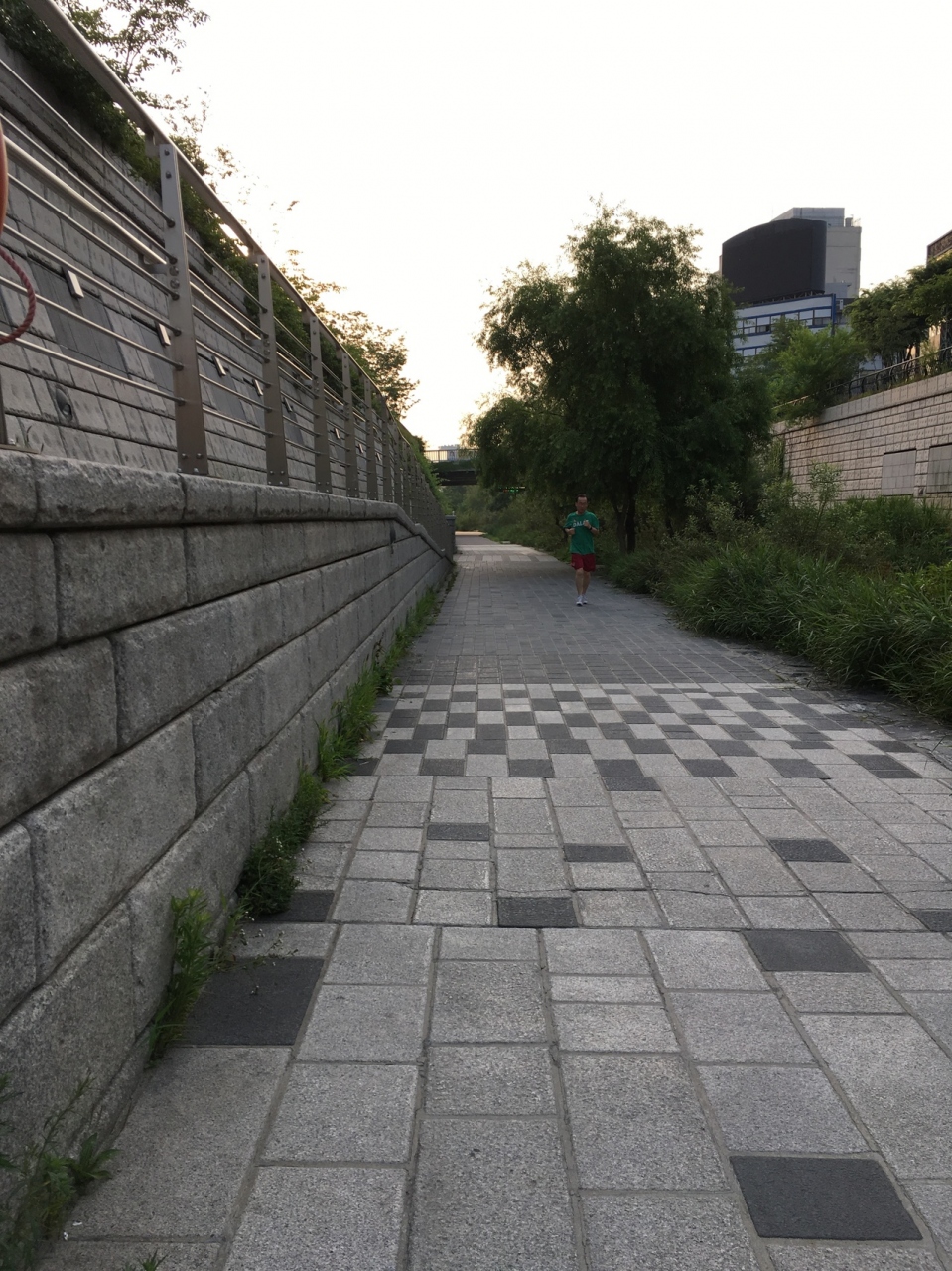 気温の低い爽やかな早朝にランニングしました。川の両側に遊歩道が整備されていて散歩する人、ランニングする人が多数いました。所々に設置されている飛び石で川を横切るのも楽しいです。遊歩道から見上げる街の様子はどこでも似たように見えたので、自分が来た所の目印を覚えていた方が迷わず帰路につけます。