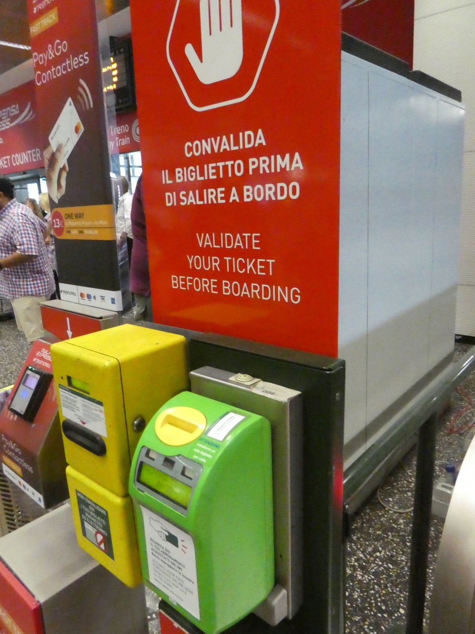 マルペンサ空港からミラノまで電車で移動するときに利用しました。チケットは窓口でも買えるようでしたが、私は販売機で買いました。販売機は日本語表示はなかったので英語表記に切り替えて購入しましたが、それほど迷うことはありませんでした。乗車前に打刻を忘れずに。