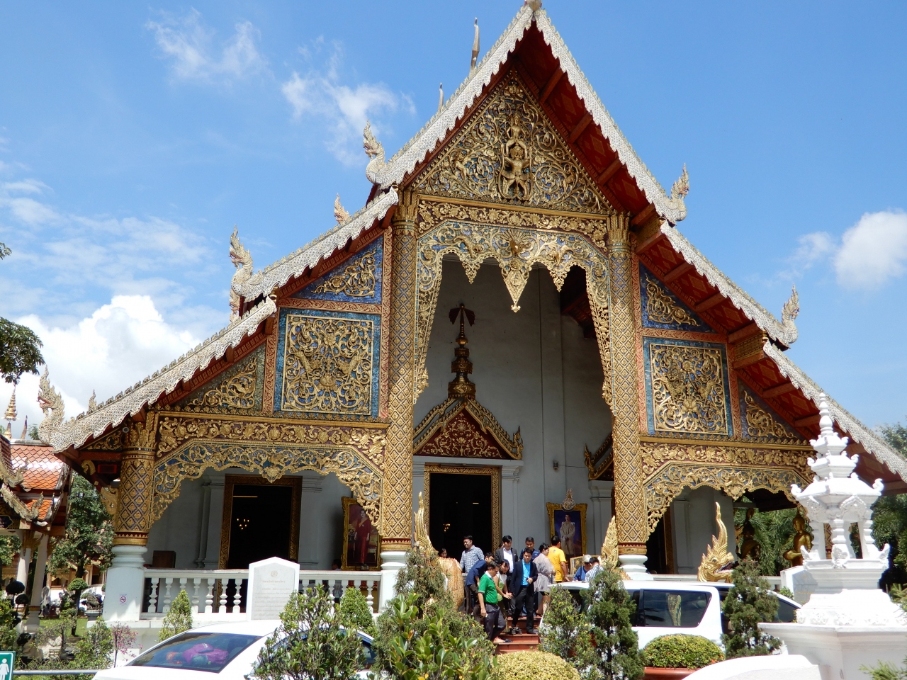 チェンマイの寺院の中でも観光客がかなり多い寺院です。本堂の中には黄金に輝く大きな仏像が3体鎮座していました。本堂の裏手には黄金に輝く仏塔が2つ。熾烈に触れ注ぐ太陽光線で輝いていました。黄金色に輝いているのは金箔を重ねて貼ったものかとじっくり見てみたら、金メッキのトタン板みたいのを被せた造りでした。