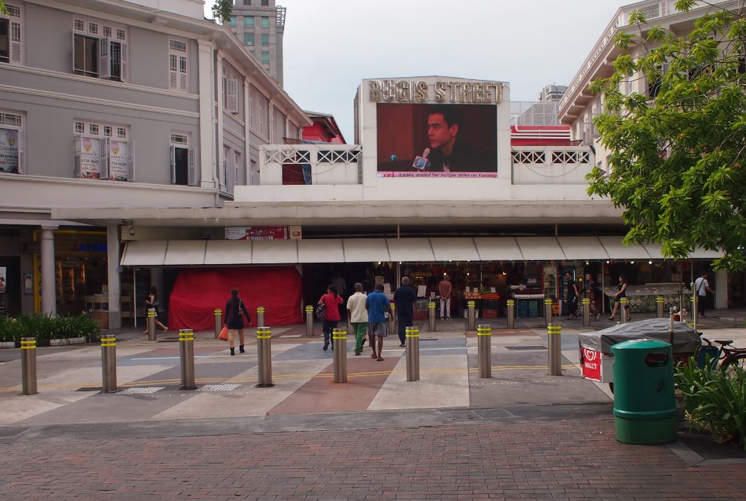 シンガーポール市内ではさすがにファッションストリートとは言い難いですが、人通りはとても多かったです。雑貨ショップや総菜屋などが立ち並んでいます。入り口にはアーケードの上に電光掲示板があって絶えず広告を流していました。