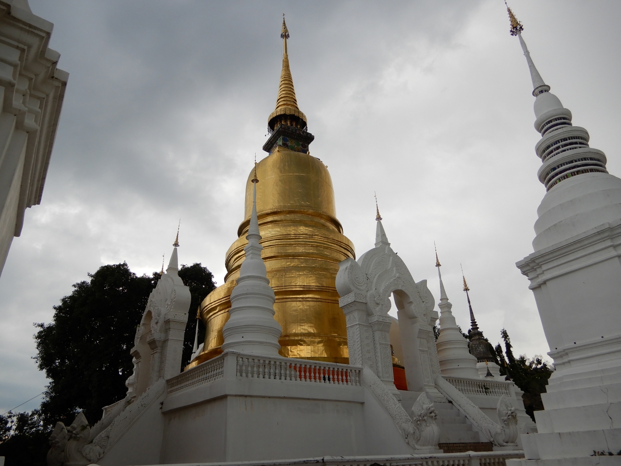 チェンマイの寺院巡り終盤で訪れましたが、すでに仏像や寺院を見まくりお腹いっぱい状態だったのに満足できた寺院でした。寺院の規模としてはチェンマイ旧市街で最大級うで、本堂内の仏像や建物の造りもよかったですが、黄金に輝く仏塔と漆喰で真っ白に塗られた数多くの仏塔群の対比も見ごたえありよかったです。