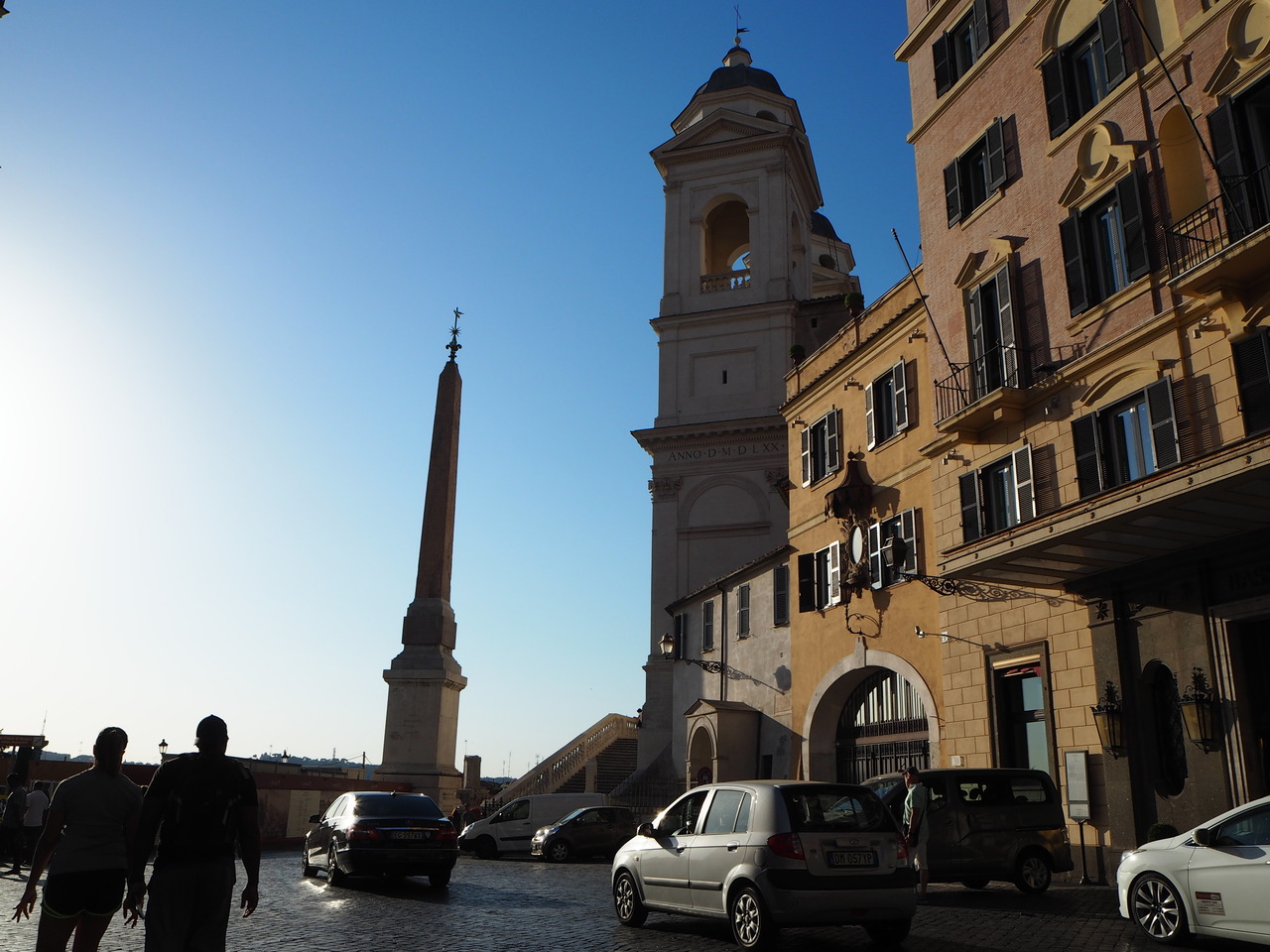 階段前には、古代エジプトのオベリスクがあり、その後ろには、左右対称に立つ2つの鐘楼が象徴的なトリニタ・デイ・モンティ教会がそびえ立っています。