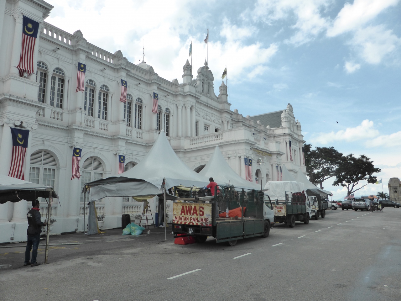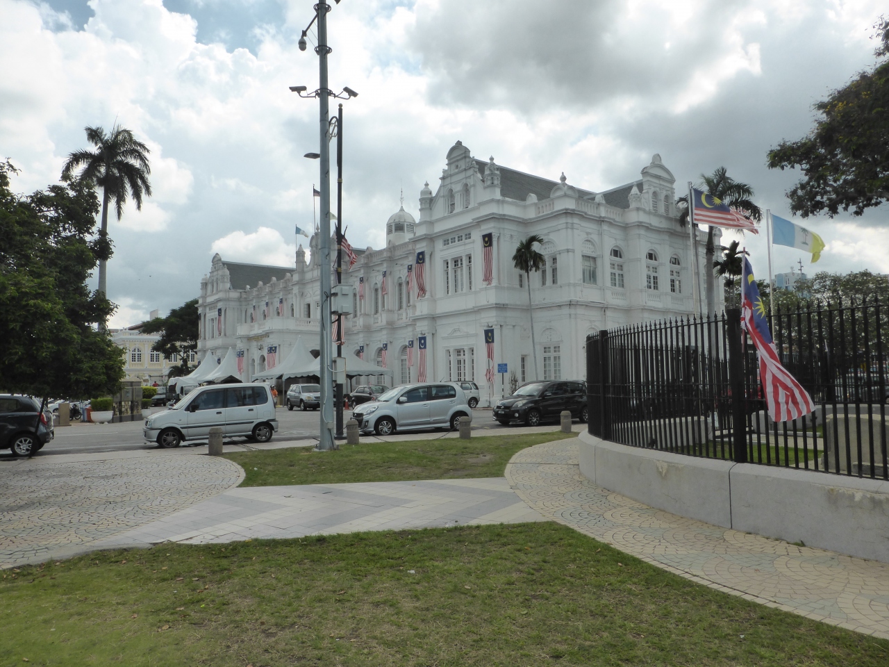 コタ・ラマ公園は海に面して広がる芝生の公園で、フードトラックも出ていました。その前にある風格のある建物がペナン市庁舎です。訪問時はイベントの後片付け中で、見るものはありませんでしたが、ここを起点に砦、インド人街、水上住宅など街歩きに出掛けました。