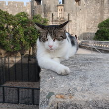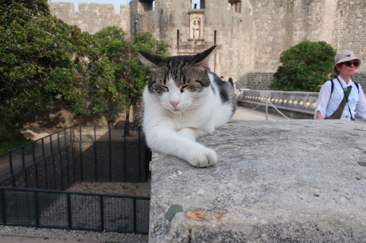 ピレ門前の広場からピレ門に続く橋です。橋と言っても下に水は流れていませんが、、この橋の下の先を見ると、ちょっとした公園のようなものが見えました。また、橋はロープで左右に人の流れを分けてあり、旧市街への入り口として人の行き来が多いことがわかります。このあたりには可愛い猫もいました。