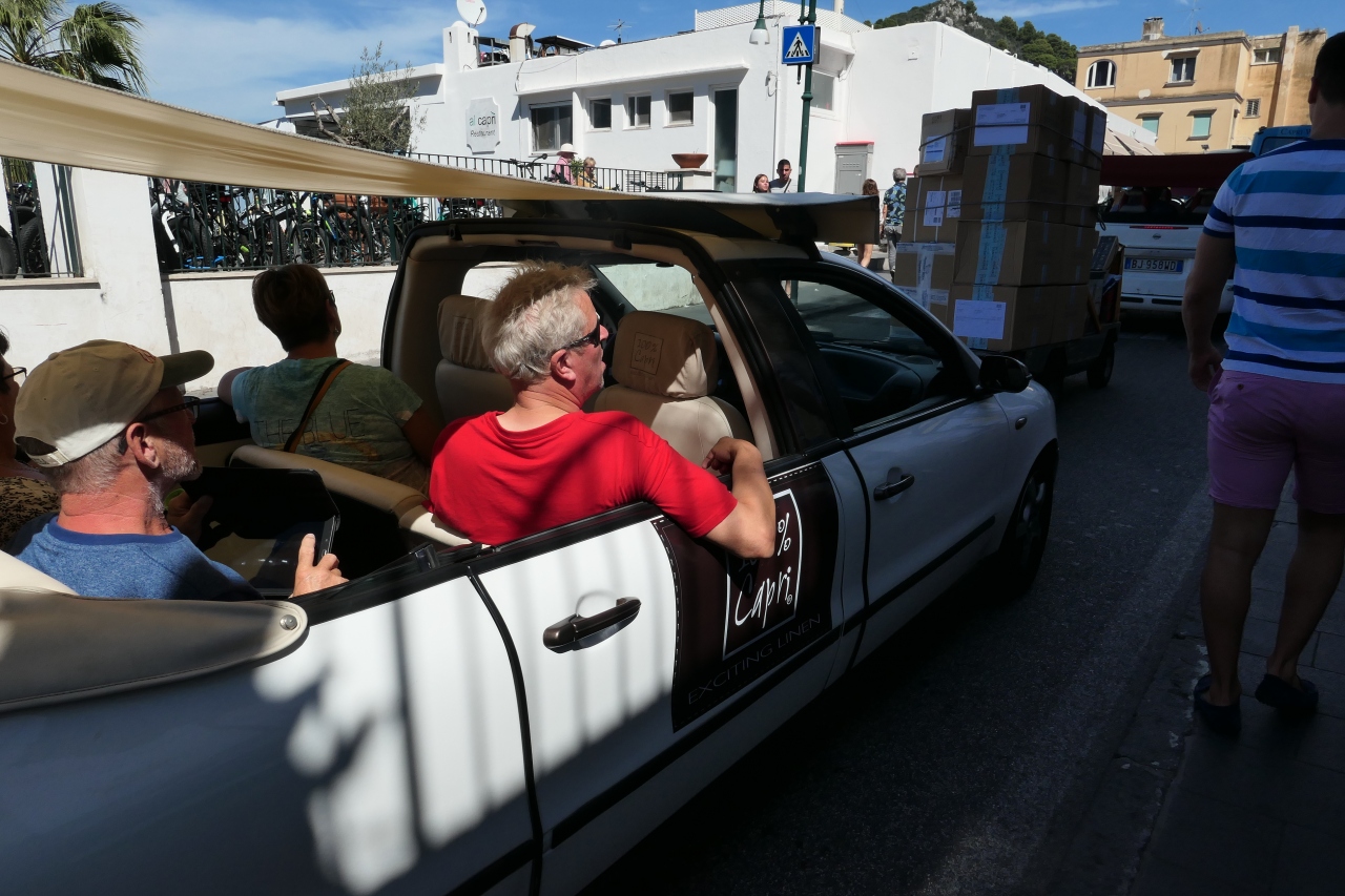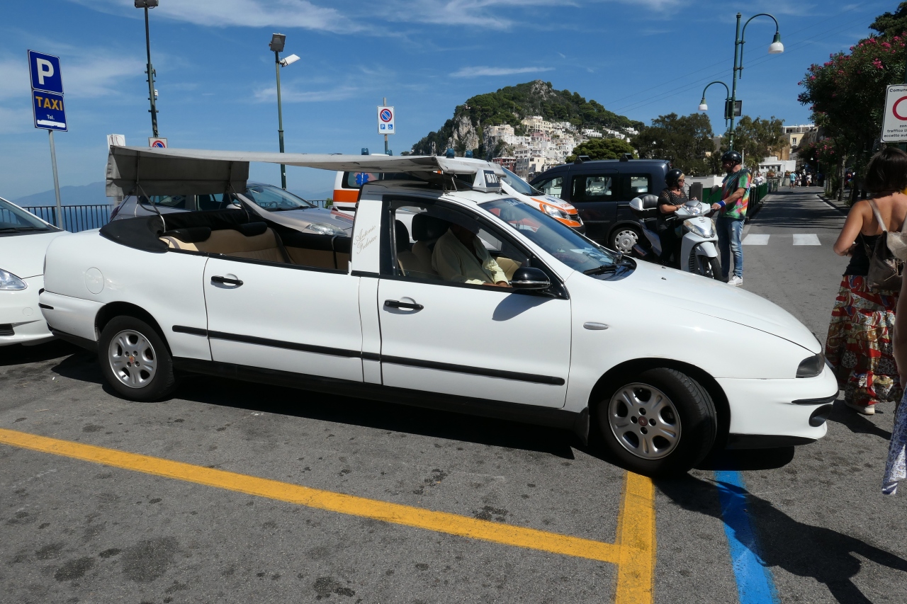 カプリ島の道路は絶壁山際をクネクネ走り、道幅も狭く、車のすれ違いも容易ではありません。ここを小型バス、商用車、そしてタクシーが走っていました。マリーナグランデ、カプリの町、アナカプリ、青の洞窟のある場所、などへの往復や観光でタクシーが使われていました。ただタクシーの形がユニークです。オープンカーに幌状の屋根が設けられた改造車です。このようなタクシーを他の場所で見かけたことはありません。カプリ固有のタクシーだろうと思いました。