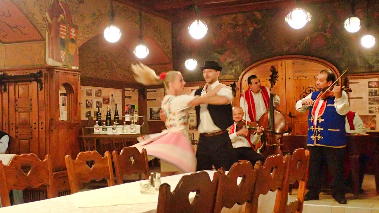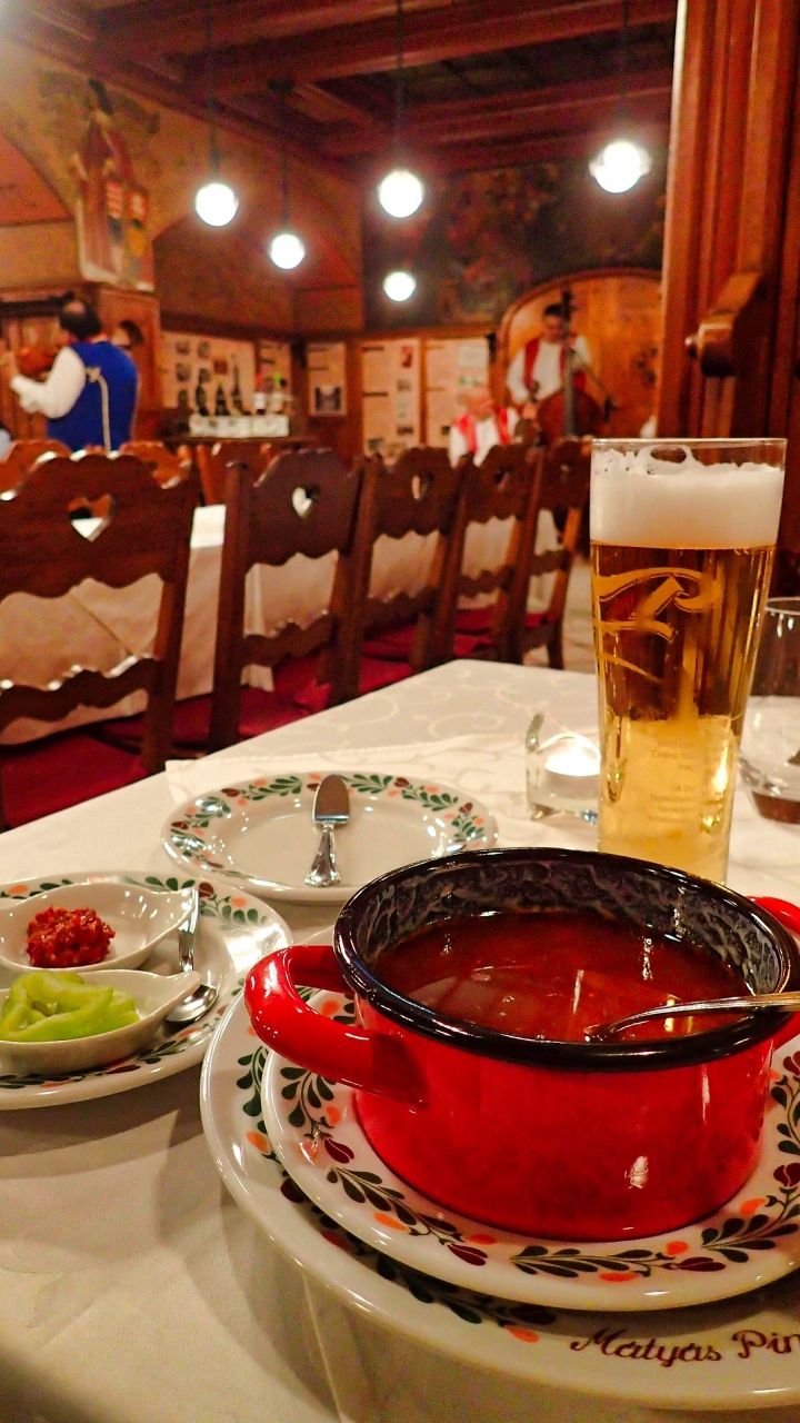 ハンガリーの最初の食事処としてこちらのレストランを選びました。宿から近く、無料のフォークロアショーがあったからなのですが、残念なことにクレジットカードが機械の故障で使えないのと貼り紙がありました。ハンガリー=物価安い、という先入観から、手持ちのキャッシュが5000Ftしかもちあわせておらず、こちらのお店ではドリンクを頼むと、メインは無理です。