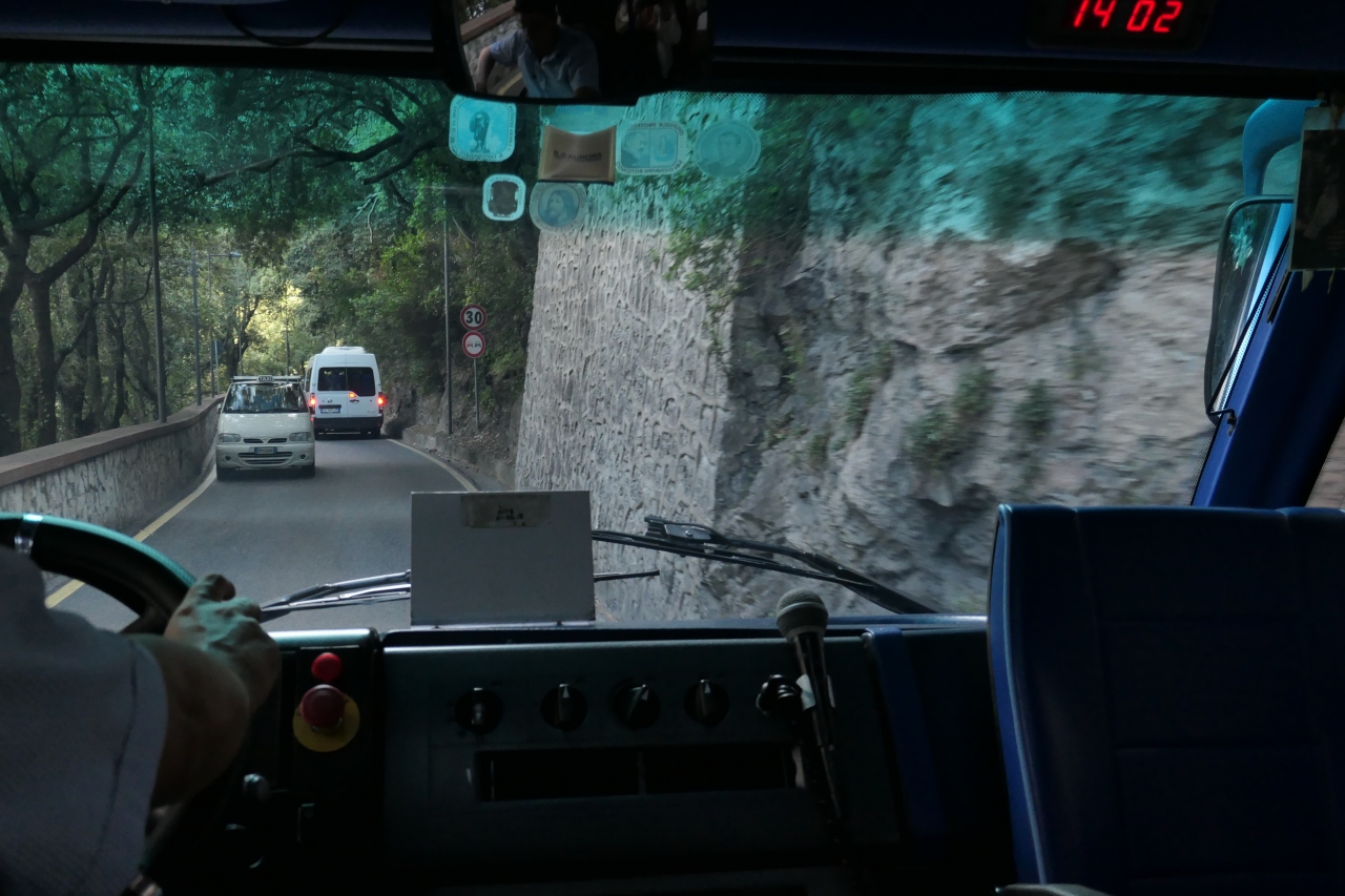カプリ島内の移動で小型観光バスを利用しました。マリーナグランデからアナカプリ経由で青の洞窟前の駐車場の往復です。道路は狭く、断崖絶壁の連続でした。小型バスは10人程度で満席になるコンパクトなバスです。曲がりくねった見通しの良くない道路ですが、ドライバーは果敢にどんどん進みました。大丈夫かな、と心配になる運転でした。道路は舗装されていますが道幅が狭いので、車のすれ違いでは細心の注意が必要です。一応、石積み防護壁がありますが絶壁での車のすれ違いではスリルがありました。バス乗車では久々のヒヤッと体験でした。