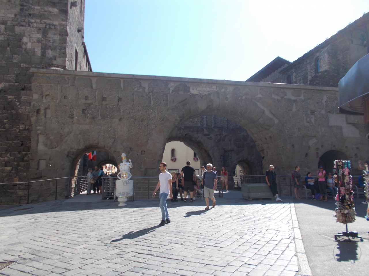 このポルタ・プレトリアはローマ時代に作られた門です。城壁で囲まれた町の東側にあります。門と城門が今も残っています。門の幅があり強固さを印象付けています。この門の脇にある建物にツーリストインホメーションがあります。