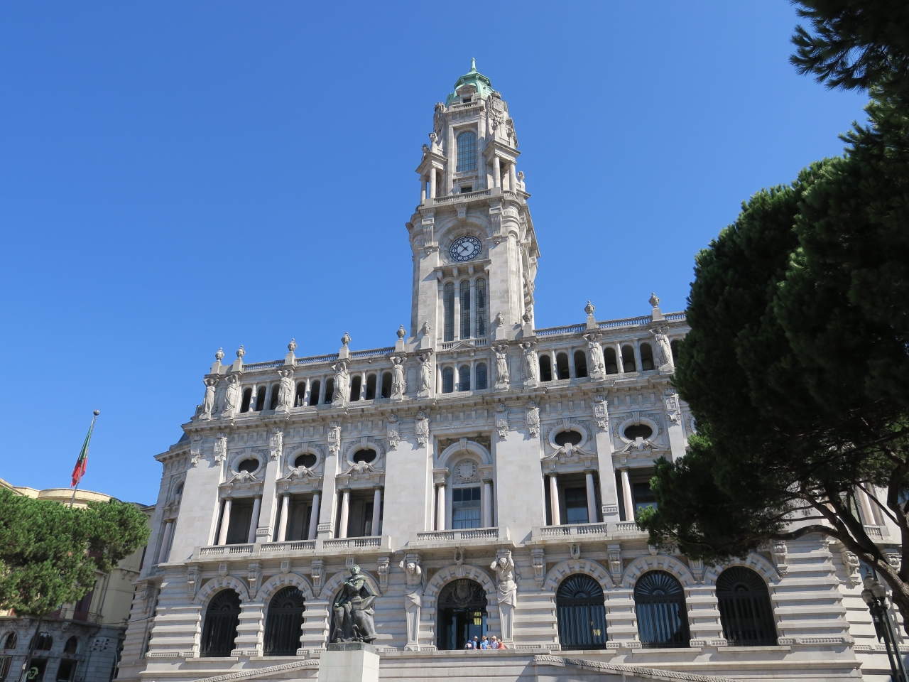 ポルト市庁舎は、「リベルダーデ広場」の北端に位置します。 リベルダーデ広場はやや傾斜があるので、市庁舎からは広場全体を見下ろすような感じになります。建物の真ん中にそびえたつ時計台が印象的で、ポルトという街の歴史を実感する光景です。内部は入り口部分までしか入ることが出来ませんでした。