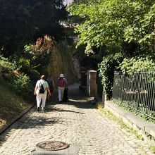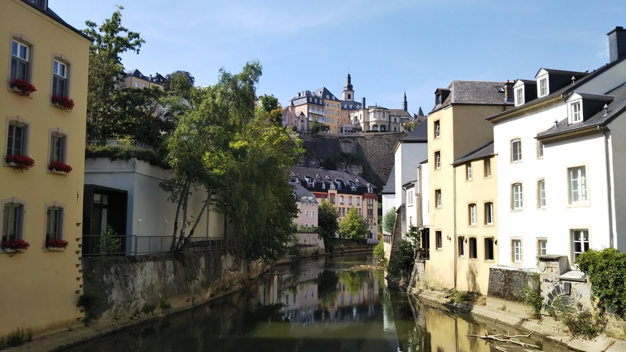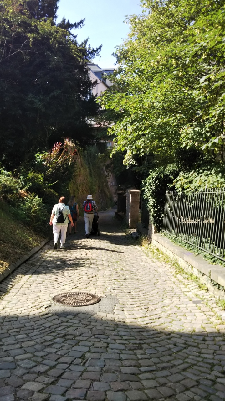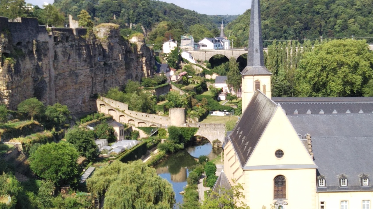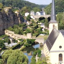 旧市街から坂を下っても行けますが、エレベーターでグルンドと呼ばれる谷底に降りると、川沿いに教会や遊歩道があり、旧市街とは全く違う雰囲気が味わえます。観光客も全く居らず、静かで落ち着いた街から、上を見上げると渓谷の深さがわかります。