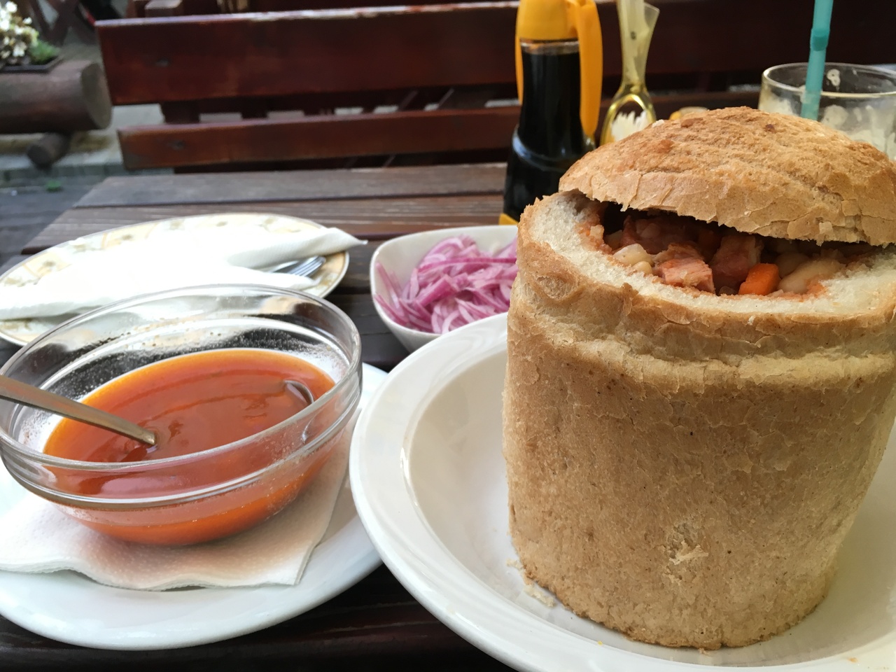 値段の割にボリュームがあり、パンに入った豆のスープはびっくりするほどの大きさ。ただし料理の味は全体的に大味で、サラダもドレッシングなどなくレモンと塩が出されたのみ。