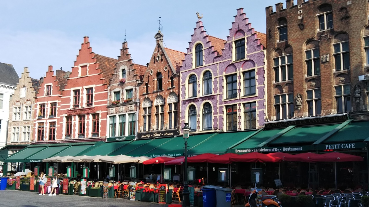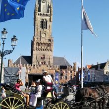旧市街の中心部で、鐘楼、ギルドハウス、観光案内所、トイレ、レストラン等、何でも揃っていますが、観光客が多い上にタクシー、バス、馬車が通るので、騒がしいです。ただ脇道に入ると、ワッフルやレース、クリスマスグッズのお店等もあります。
