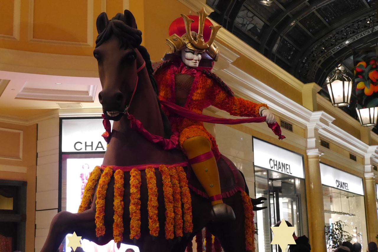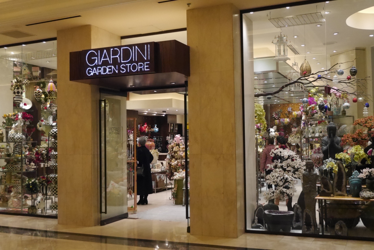通路の真ん中に面を被った騎馬武者像が置かれ、通りのアクセントになっています。床の絨毯も豪華な造りで、歩く音を消してくれます。植物園関連のショップやスタバもあるので気軽に覗ける所もありますが、基本はブランドショップ通りで、ウインドショッピングがメインになります。