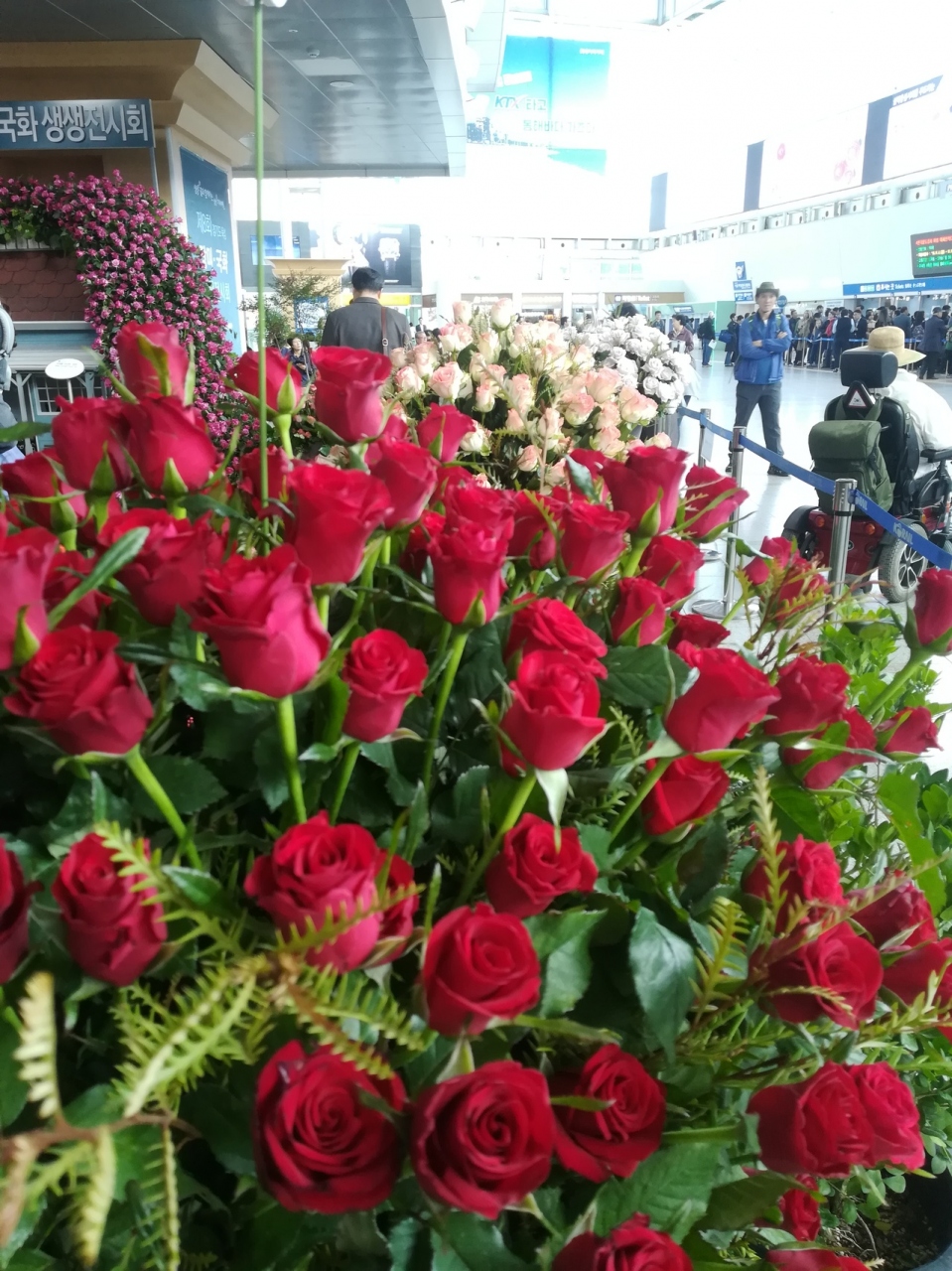 駅構内には 通行人も見やすい場所で お花の展示の催し物をやっていました。