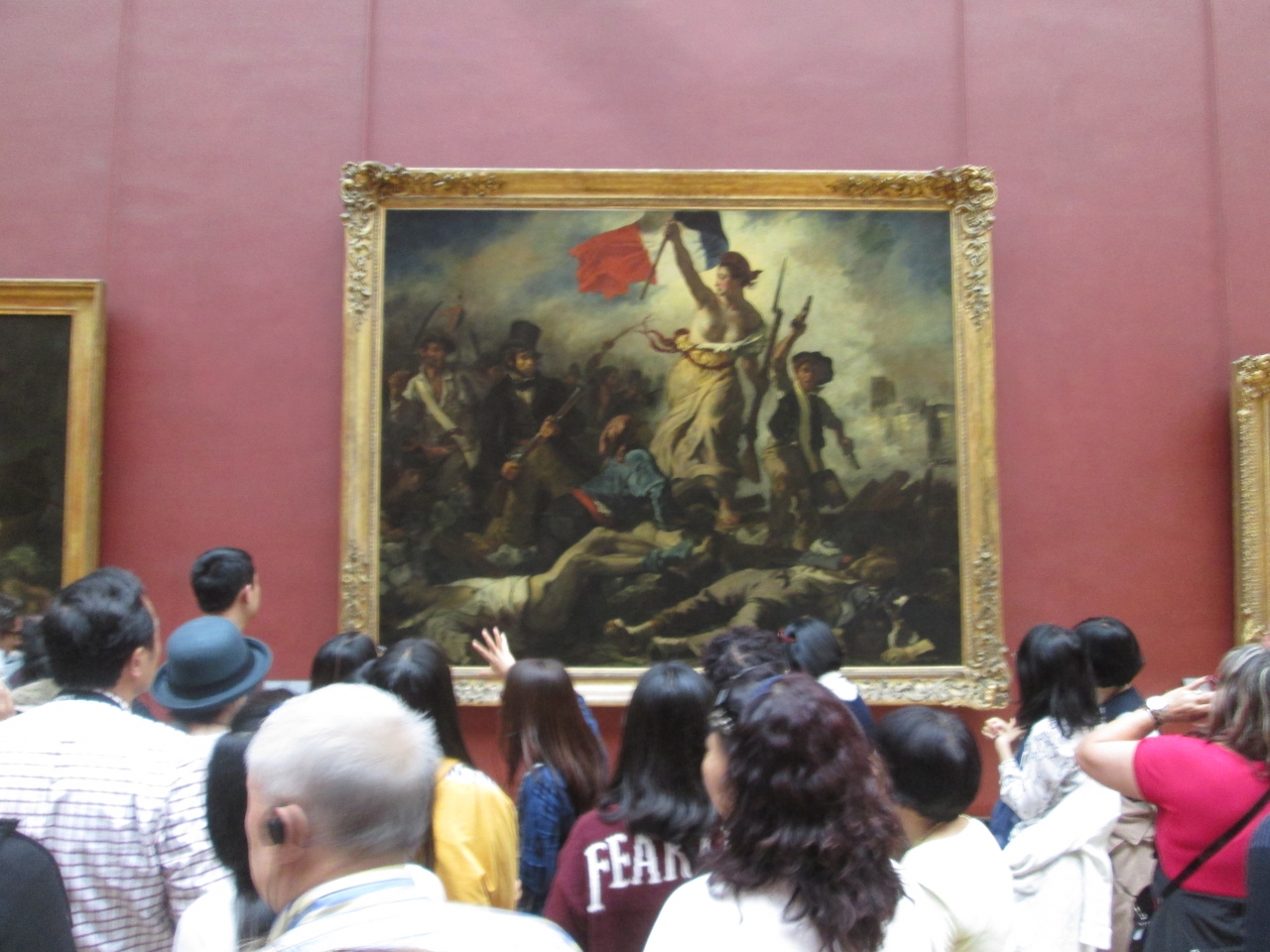 ルーヴル美術館で必ず見たい作品のひとつです。フランスのシンボル、マリアンヌ。フランス共和国を象徴する女性像で、ユーロ硬貨、切手などに描かれたりしています。一度は目をしたことがある絵だと思います。モナリザの絵に向かって進み過ぎた部屋の突きあたりが売店で、その左の部屋にありました。2018年1月から閉鎖されるとの情報があることからか見学者の多い絵でした。