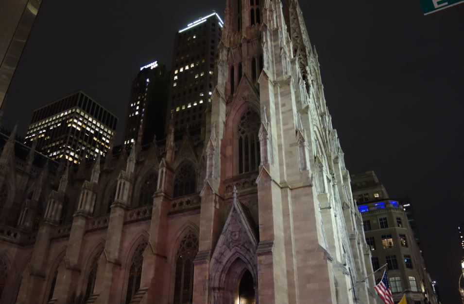 セントラルパークから五番街を南に下ってすぐにある教会がセントパトリック大聖堂(Saint Patricks Cathedral)です。住所的にはマディソンスクエアですね。夜であったので中には入れませんでしたがライトアップされていて夜空の浮かぶシャープに天を突くような建物でした。
