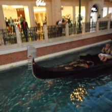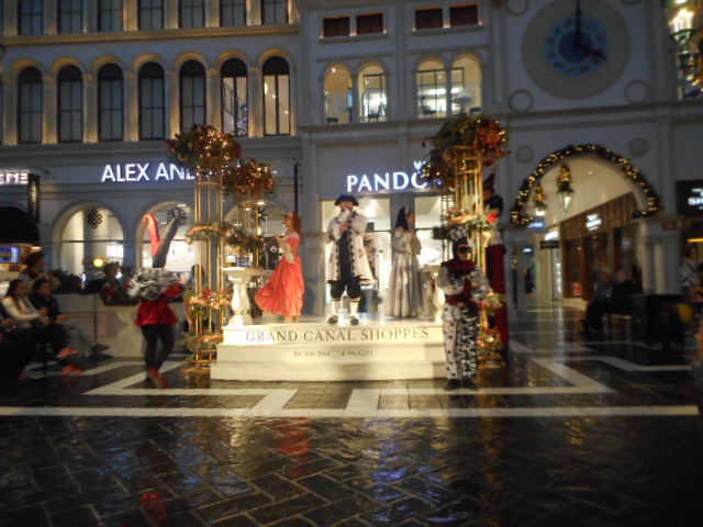 ベネチアンホテルとパラッツオホテルはカジノ場で繋がっています。ベネチアンホテルには有料の運河があり、運河沿いにショツピング店が軒を並べていますので、散策しながら店を覗きます。サンマルコ広場では決められた時間で、無料のオペレッタのミニ寸劇ショーもあり楽しめます。