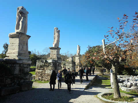 2階建てだったらしいですが、現在は礎石と3体の像があります。像を見てみると、トリトンなどですが、頭の部分は別の場所に保管されているので、よくわかりません。
