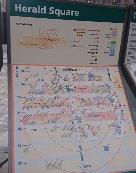 ブロードウエイと6thアベニューが交わる少し手前にあるニューヨークでは小さな広場がヘラルドスクエアー(Herald Square)です。34丁目のショッピングの際に自分の位置確認として目印にしました。近くに近くにトイレもあります。