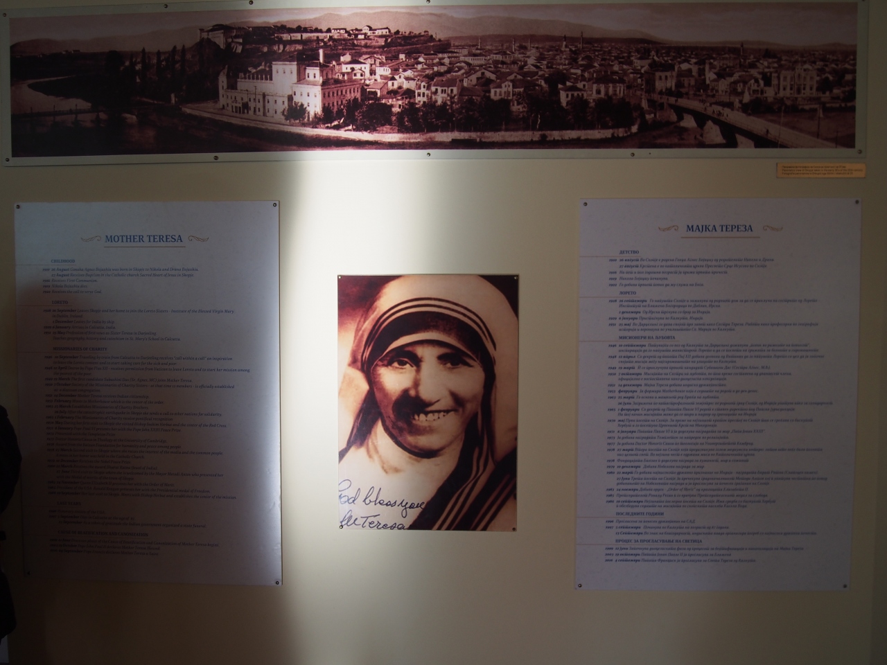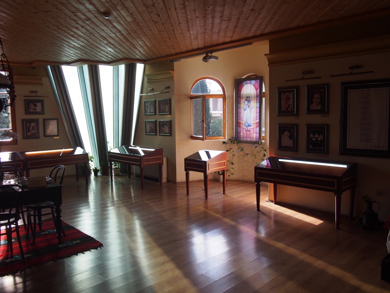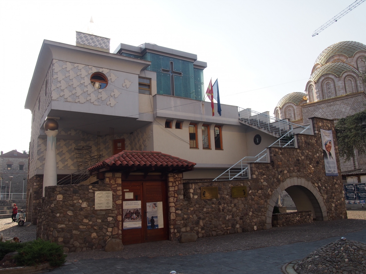 マケドニア広場からマケドニア通りを1、2分歩くと左側に見えます。マザーテレサはアルバニア系のマケドニア生まれということで、こちらスコピエに博物館があります。マザーテレサはコソボ、マケドニア、アルバニアでは記念のモニュメントなどをよく目にすることも多いです。記念館内にはマザーテレサの生まれてからの生涯、ノーベル平和賞受賞の業績などが説明付きで展示されています。館内は無料で見学できます。最上階には礼拝堂があります。