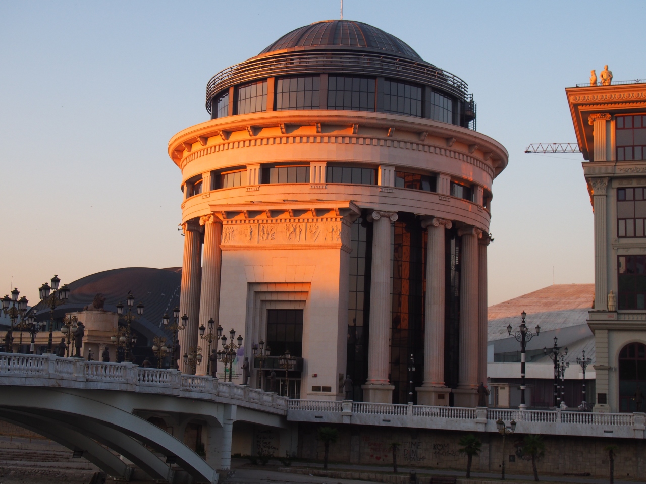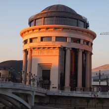 スコピエ市街地のヴァルダル川沿いの旧市街側に建物はあります。ヴァルダル川にかかるカメン・モストとアートブリッジのあいだにあります。また国立考古学博物館と外務省のあいだにあります。建物は円筒状で頂上部はドーム状の風格を感じるものです。建物のすぐ前のアイブリッジからの眺めは素晴らしいです。特にライトアップされた景観はいいです。