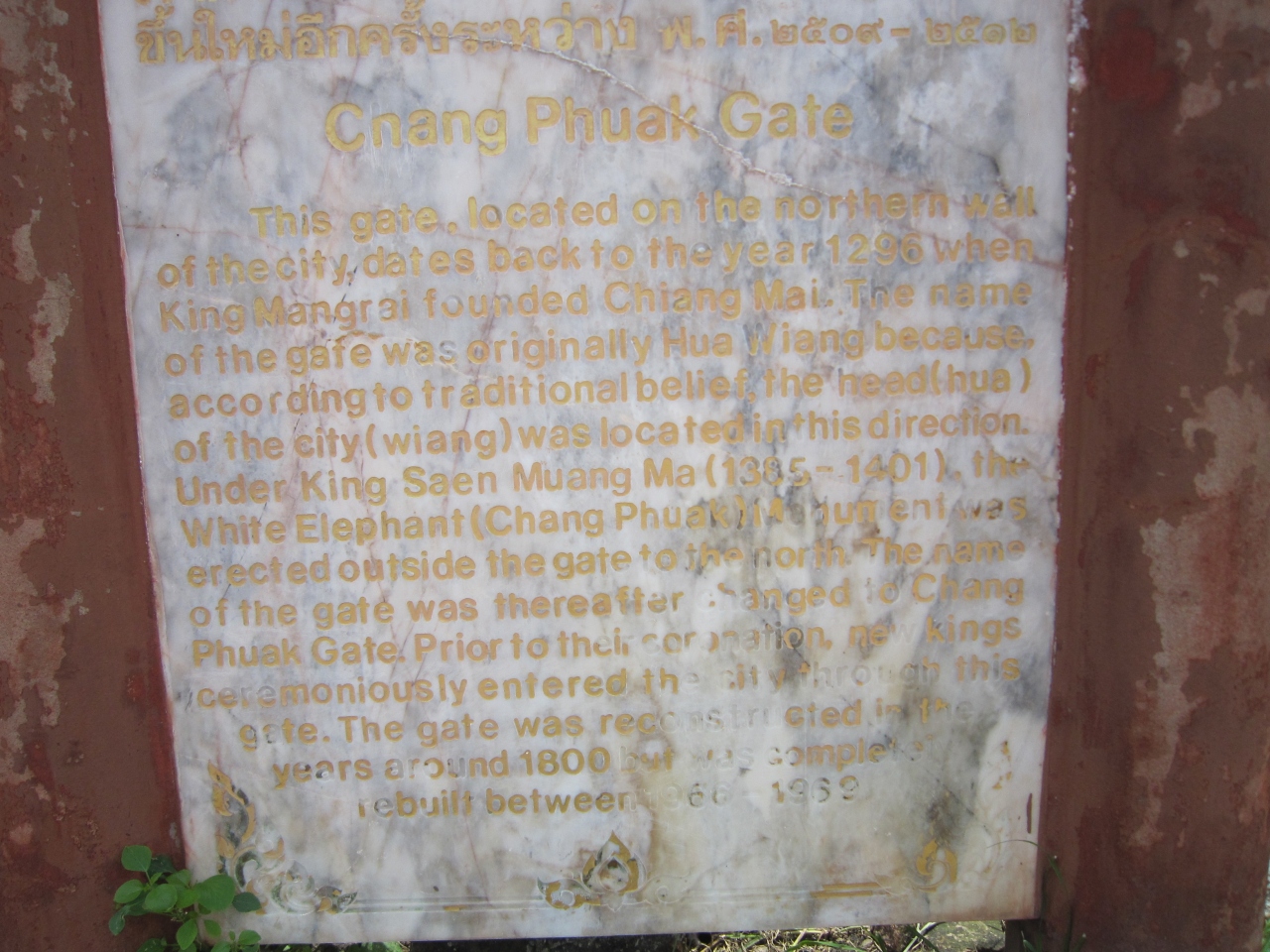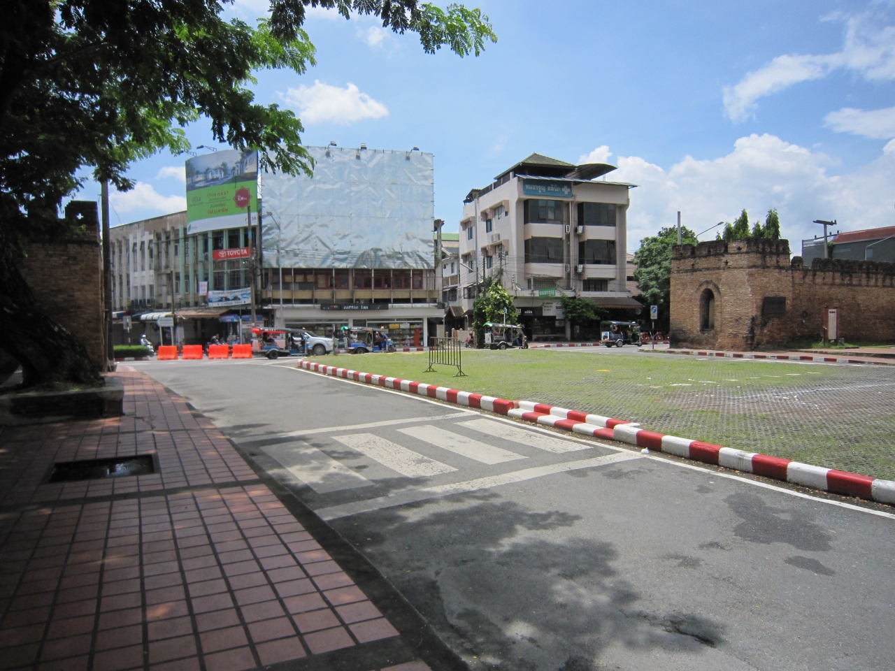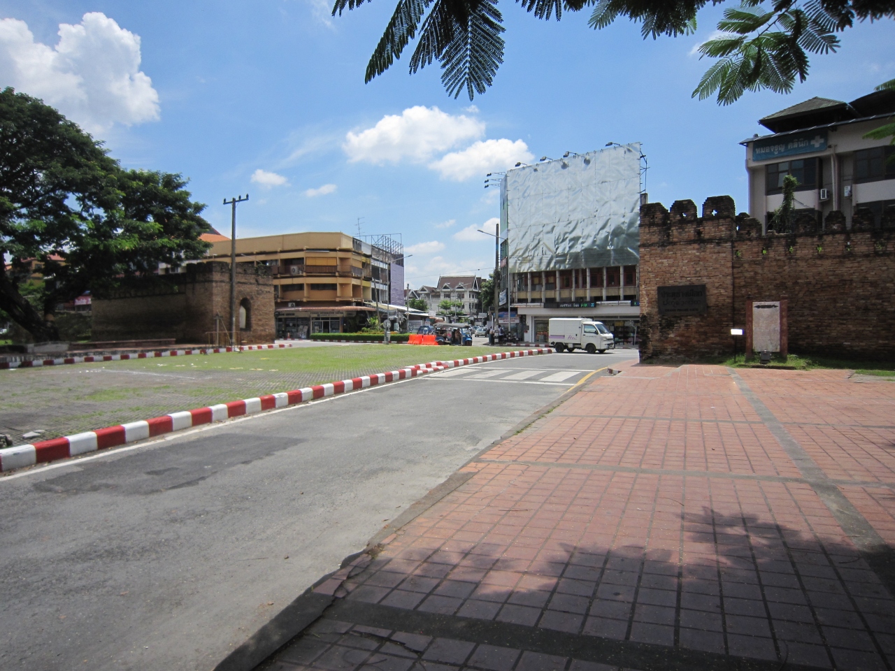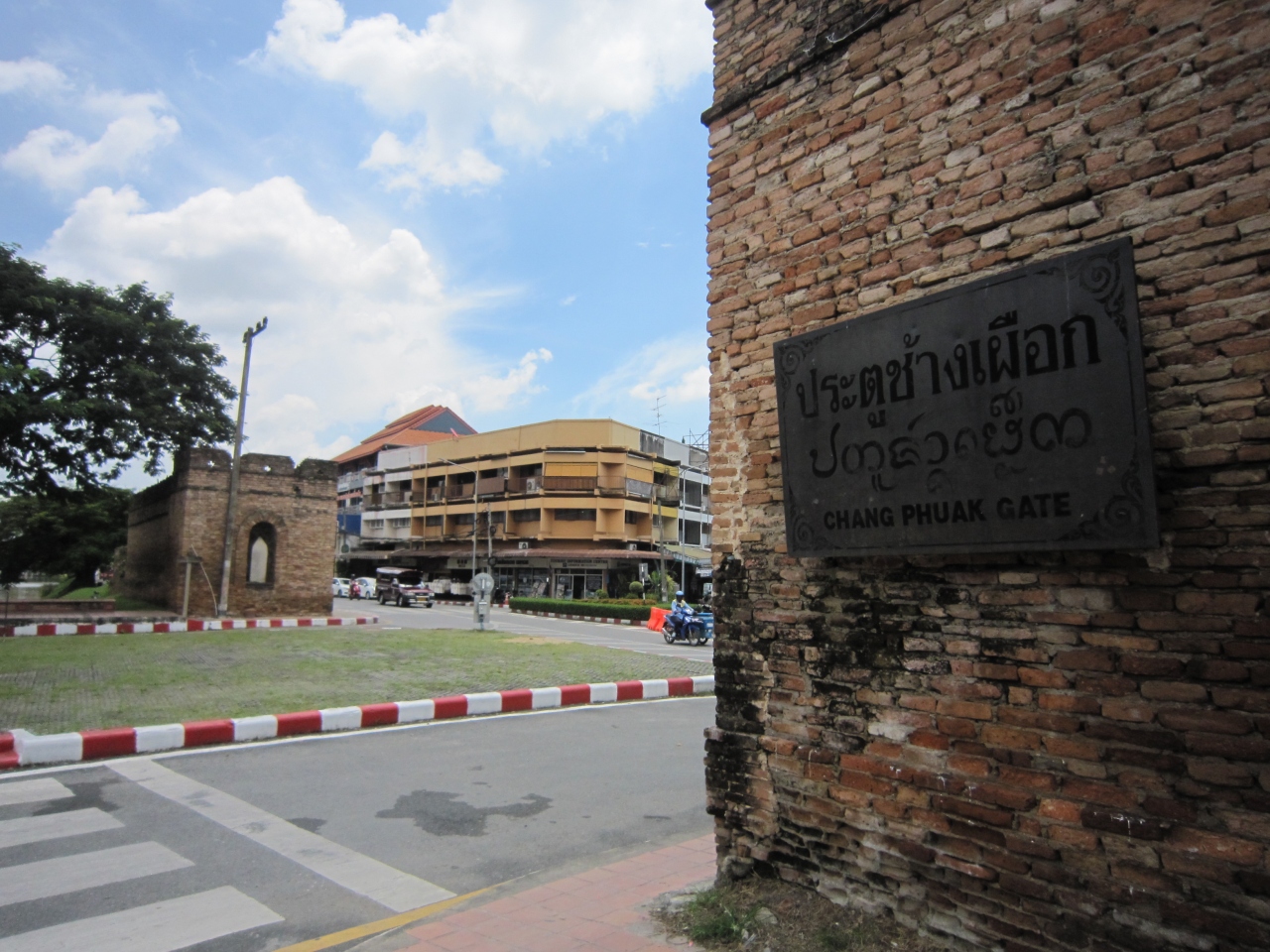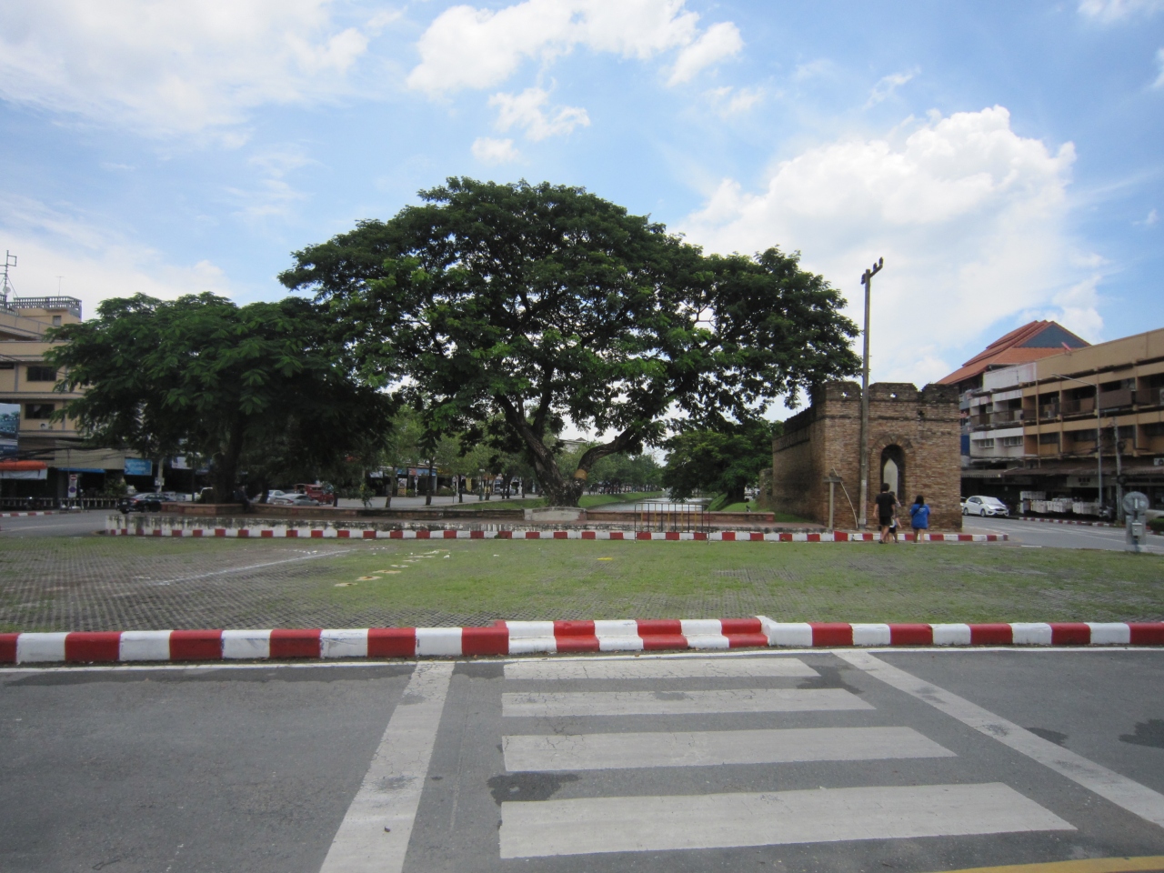 北方面を守るための門だったそうですが、今は城壁だけです。説明板があります。堀の内側から外側に行く車、逆に来る車が通ります。どんどん来ます。堀の内側、外側の道路とも車が多いです。外側に行くにはチャーンプアック市場前に歩行者用信号機があり、横断するのは楽です。ターペー門から旧市内のお寺等を見ながら歩き、この門の近くにもお寺が並んであり、門はついでに見るだけです。わざわざ見学に来る人は少ないと思います。
