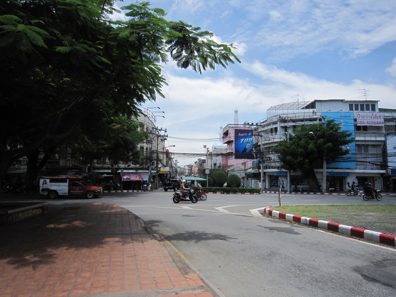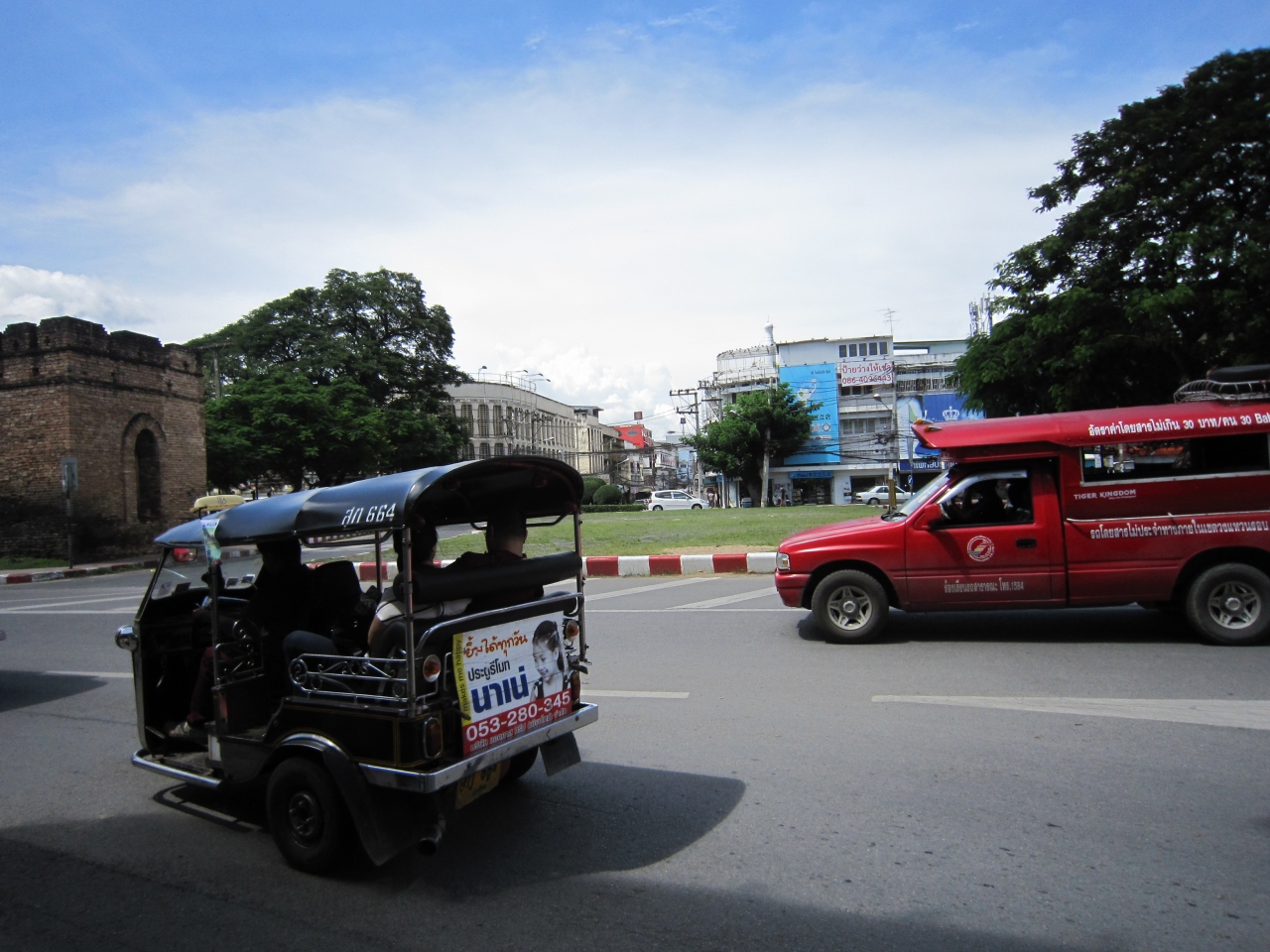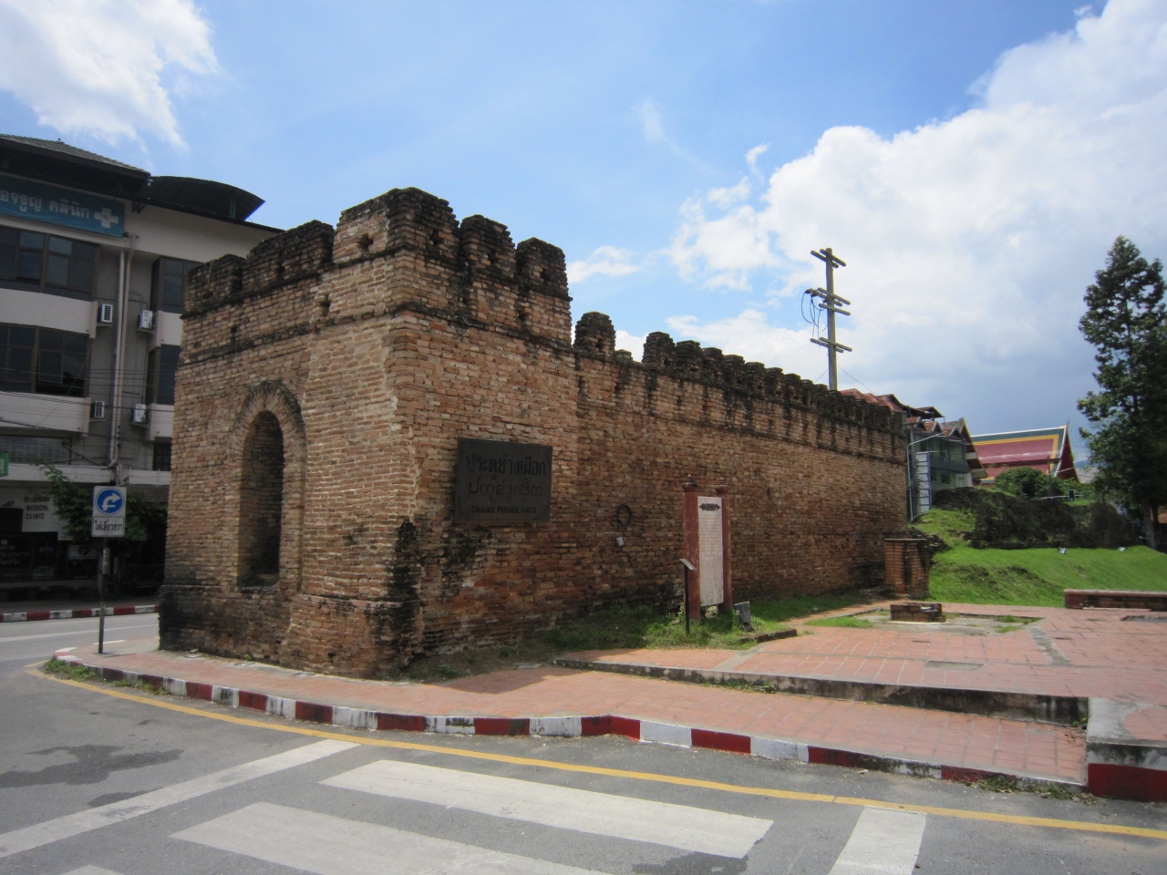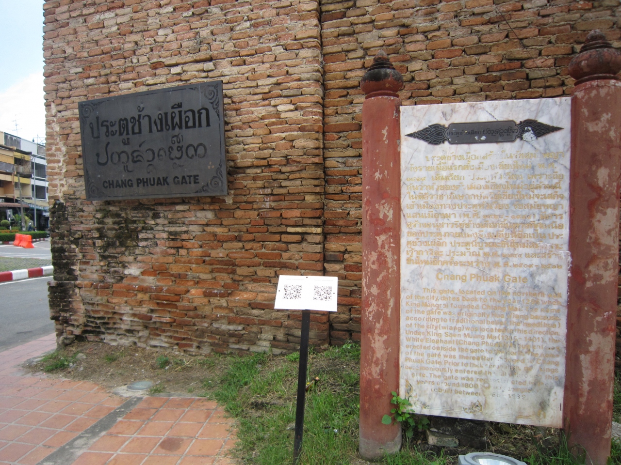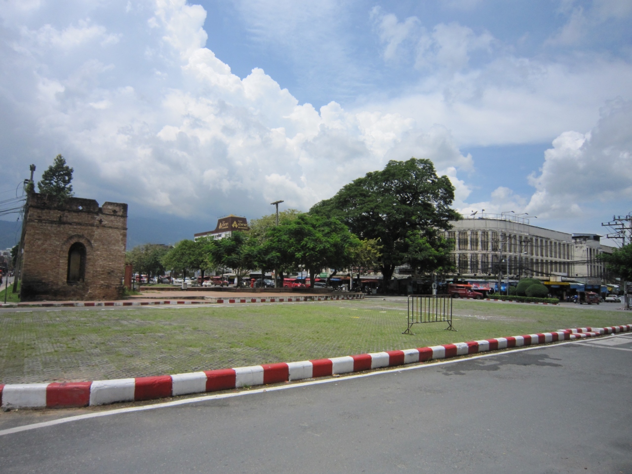 北方面を守るための門だったそうですが、今は城壁だけです。説明板があります。堀の内側から外側に行く車、逆に来る車が通ります。どんどん来ます。堀の内側、外側の道路とも車が多いです。外側に行くにはチャーンプアック市場前に歩行者用信号機があり、横断するのは楽です。ターペー門から旧市内のお寺等を見ながら歩き、この門の近くにもお寺が並んであり、門はついでに見るだけです。わざわざ見学に来る人は少ないと思います。