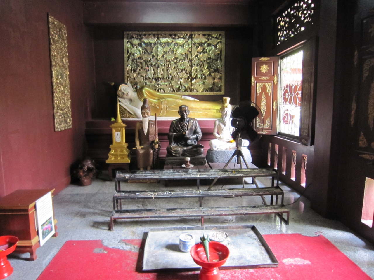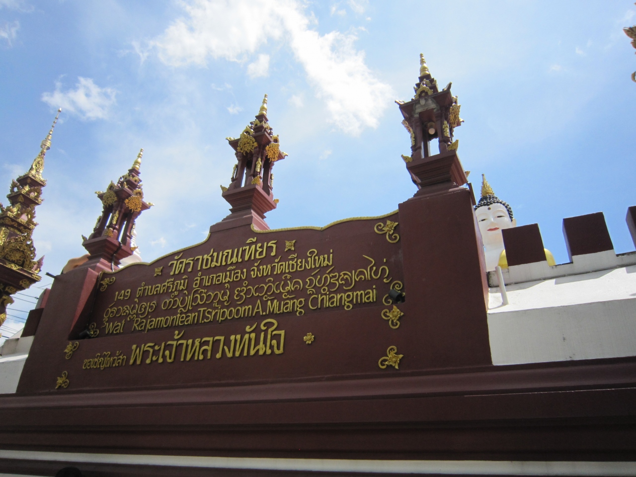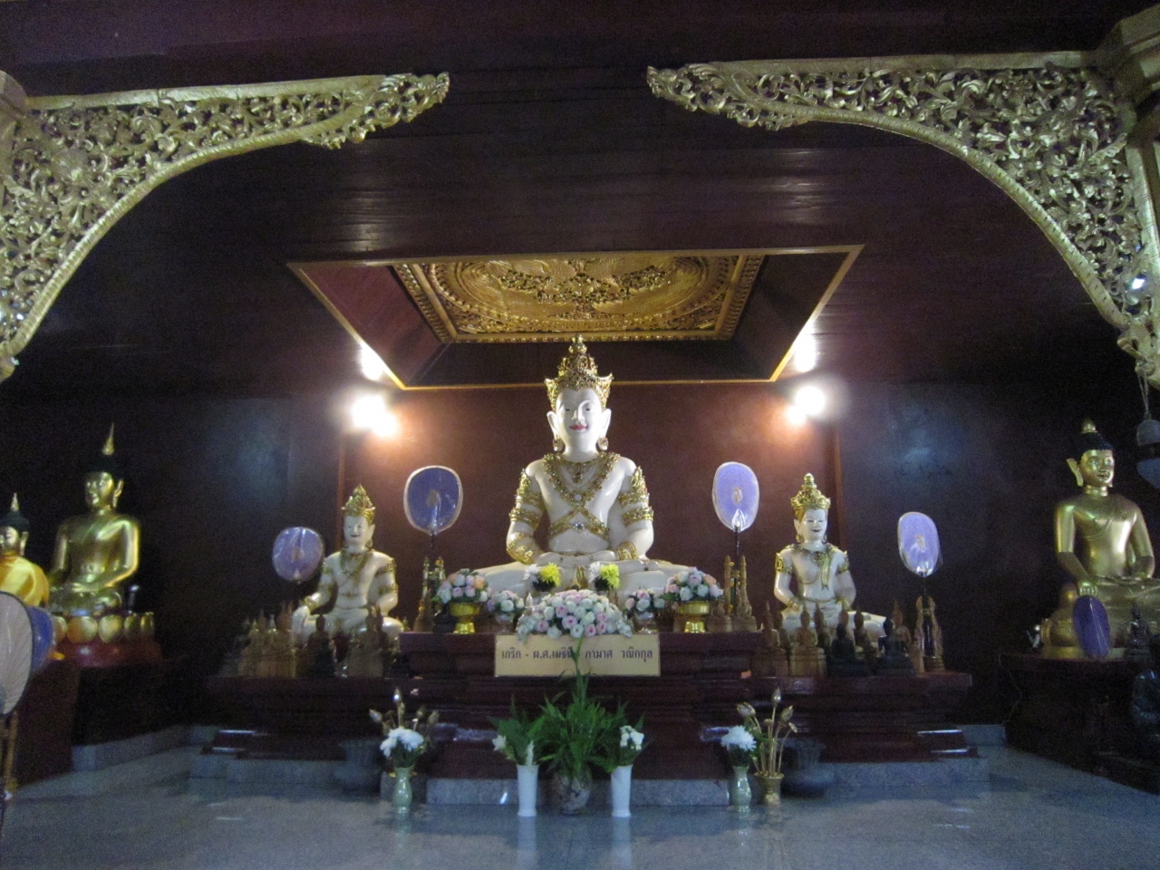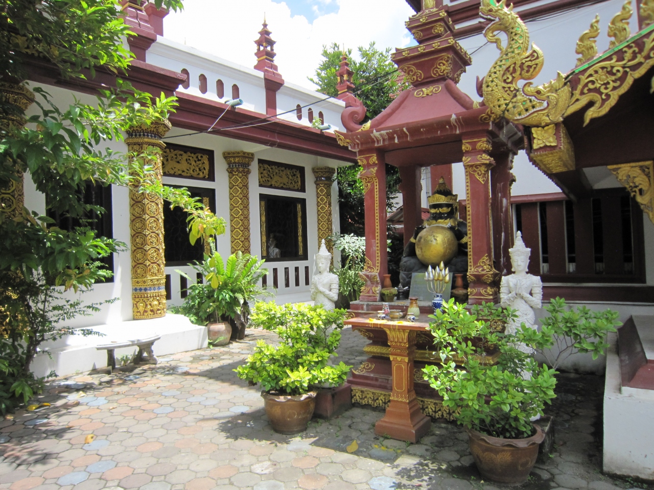 ワット・プラシンから出て前の通りを左へ、お堀の通り出て右に曲がった所です。お堀をはさみワット・ロークモリーの向かいです。お堀側から見ると大きな金色の仏像が見えます。礼拝堂は2階建て、1階には入れます。仏像は白い陶製のようで、その右奥には涅槃像があります。2階の礼拝堂には入れませんでしたが、外にある大きな金色の仏像のそばに1階内部からと外部から行けます。金ぴかに光り大きな仏像です。晴れていたので仏像がより一層耀き眩しかったです。靴を脱いで行きますので足の裏が汚れます。そこから礼拝堂の横を通り仏塔まで以前は行けましたが、今は立入禁止でした。お堀が見渡せますので気持ちが良かったです。