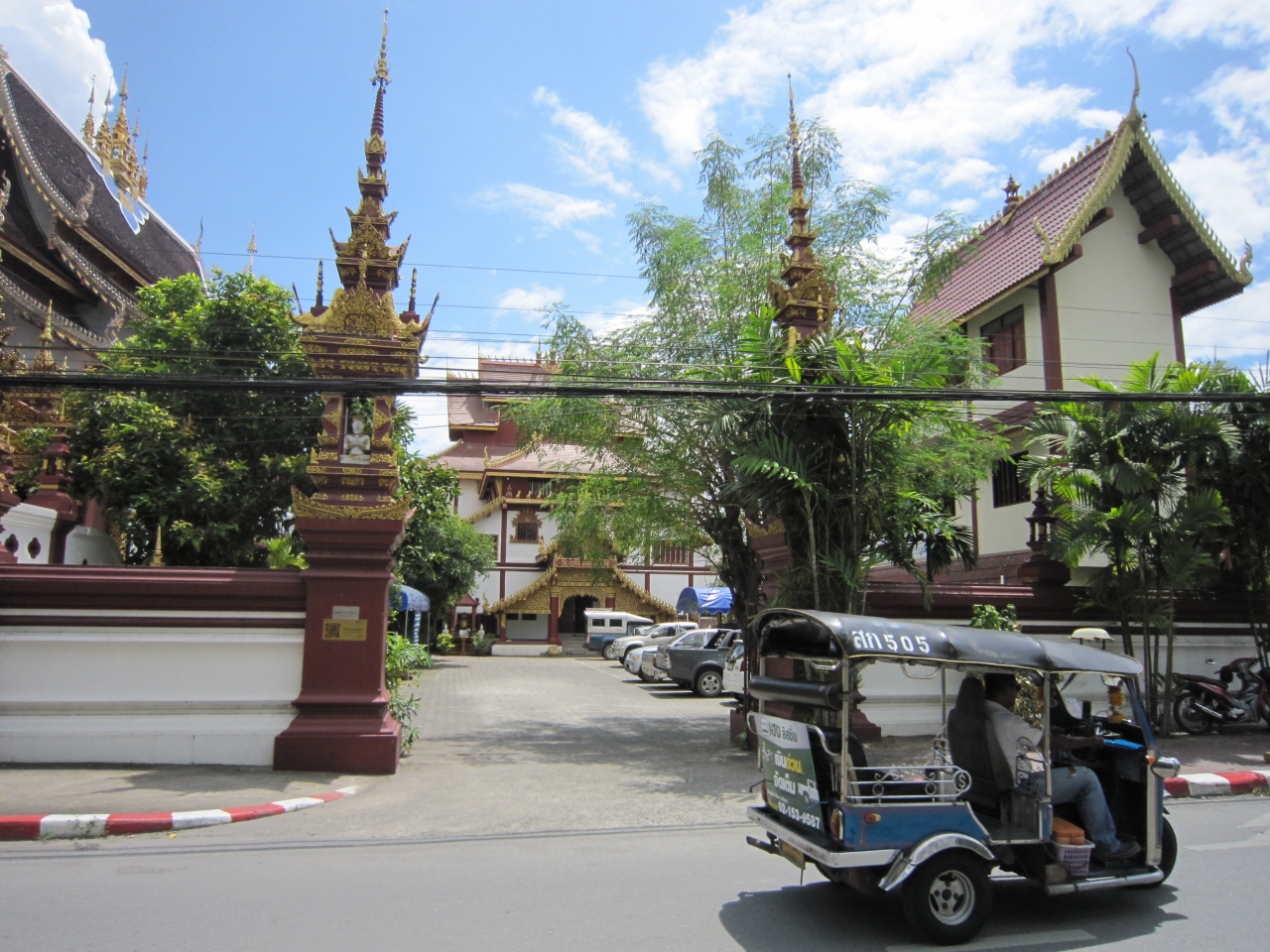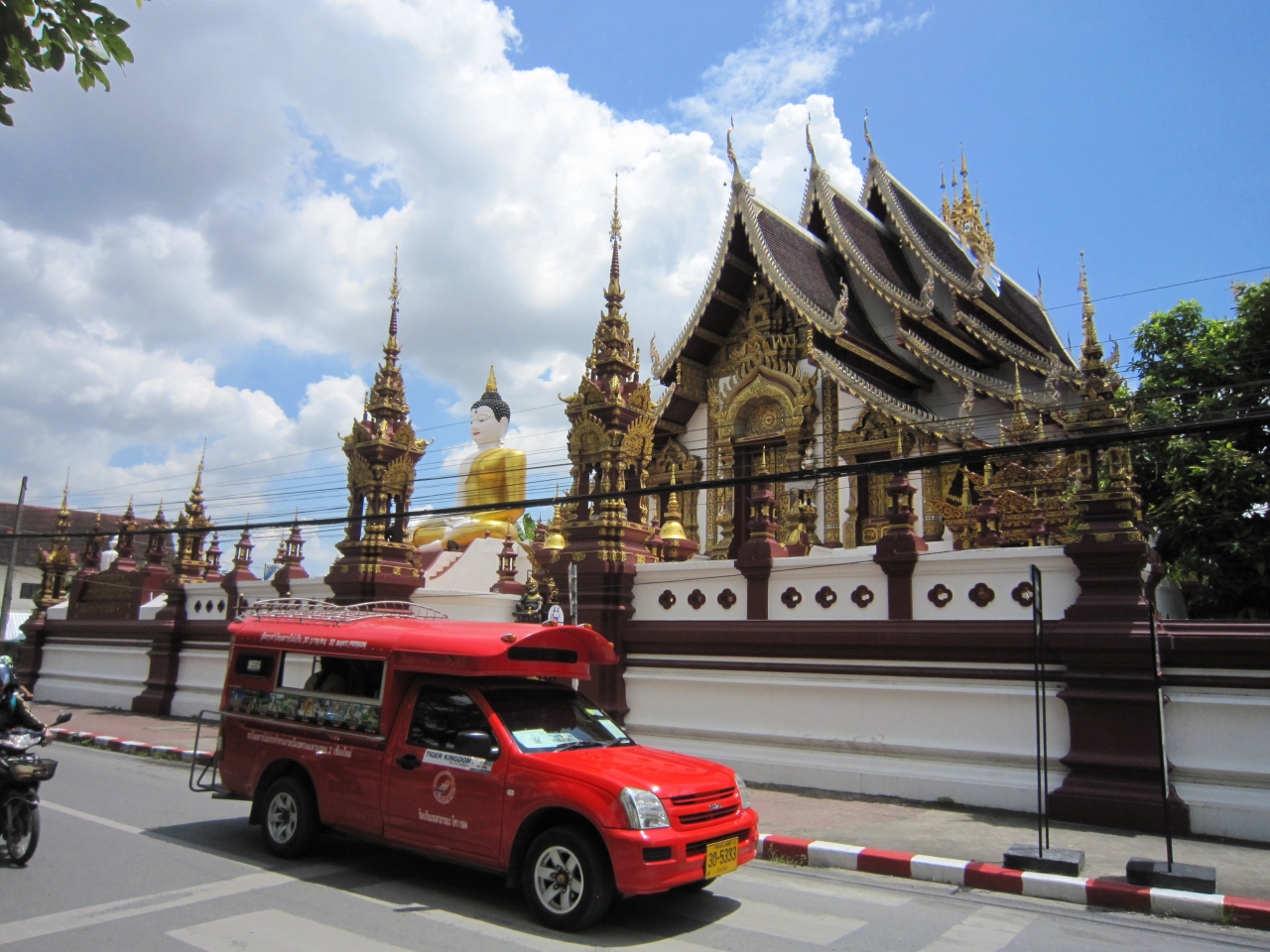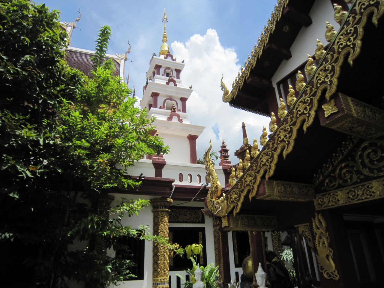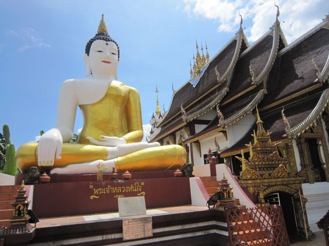 ワット・プラシンから出て前の通りを左へ、お堀の通り出て右に曲がった所です。お堀をはさみワット・ロークモリーの向かいです。お堀側から見ると大きな金色の仏像が見えます。礼拝堂は2階建て、1階には入れます。仏像は白い陶製のようで、その右奥には涅槃像があります。2階の礼拝堂には入れませんでしたが、外にある大きな金色の仏像のそばに1階内部からと外部から行けます。金ぴかに光り大きな仏像です。晴れていたので仏像がより一層耀き眩しかったです。靴を脱いで行きますので足の裏が汚れます。そこから礼拝堂の横を通り仏塔まで以前は行けましたが、今は立入禁止でした。お堀が見渡せますので気持ちが良かったです。