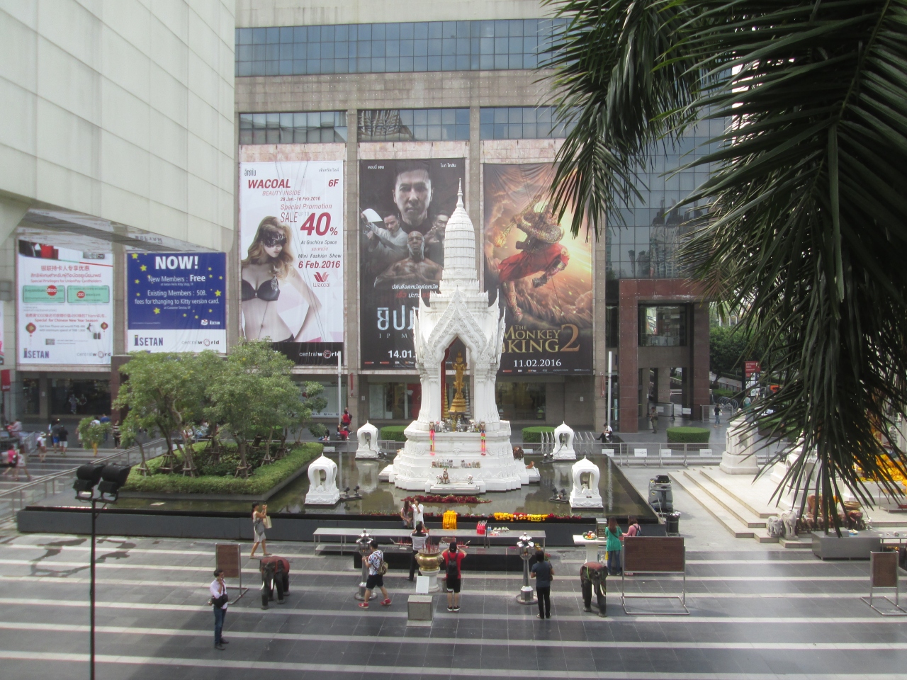 参拝には作法があるようでした。後方で見ていると、赤いバラを9本にジャスミンの花輪1輪、赤い線香を9本用意して果物を備える人たちが多かったです。木曜夜9時30分がもっとも混雑する場所らしいのですが、日中であってもついでに寄ったときにお祈りするという光景がありました。