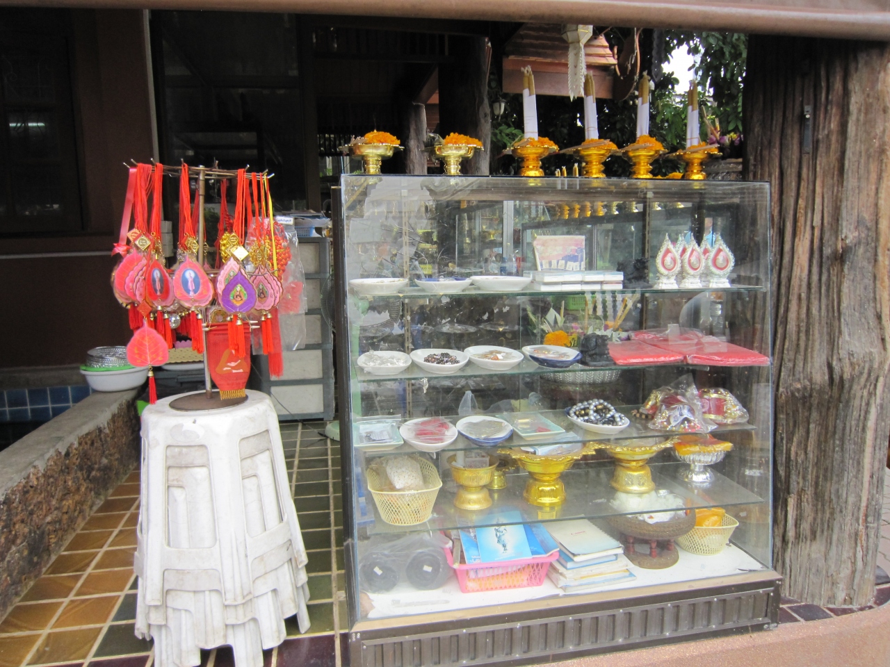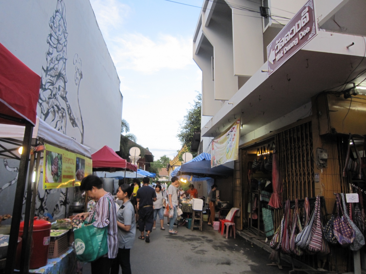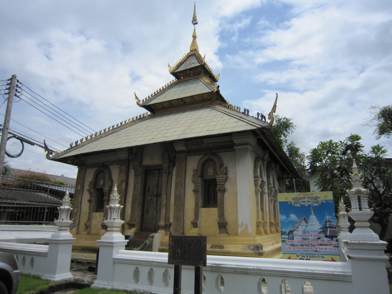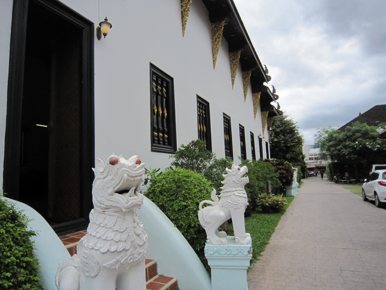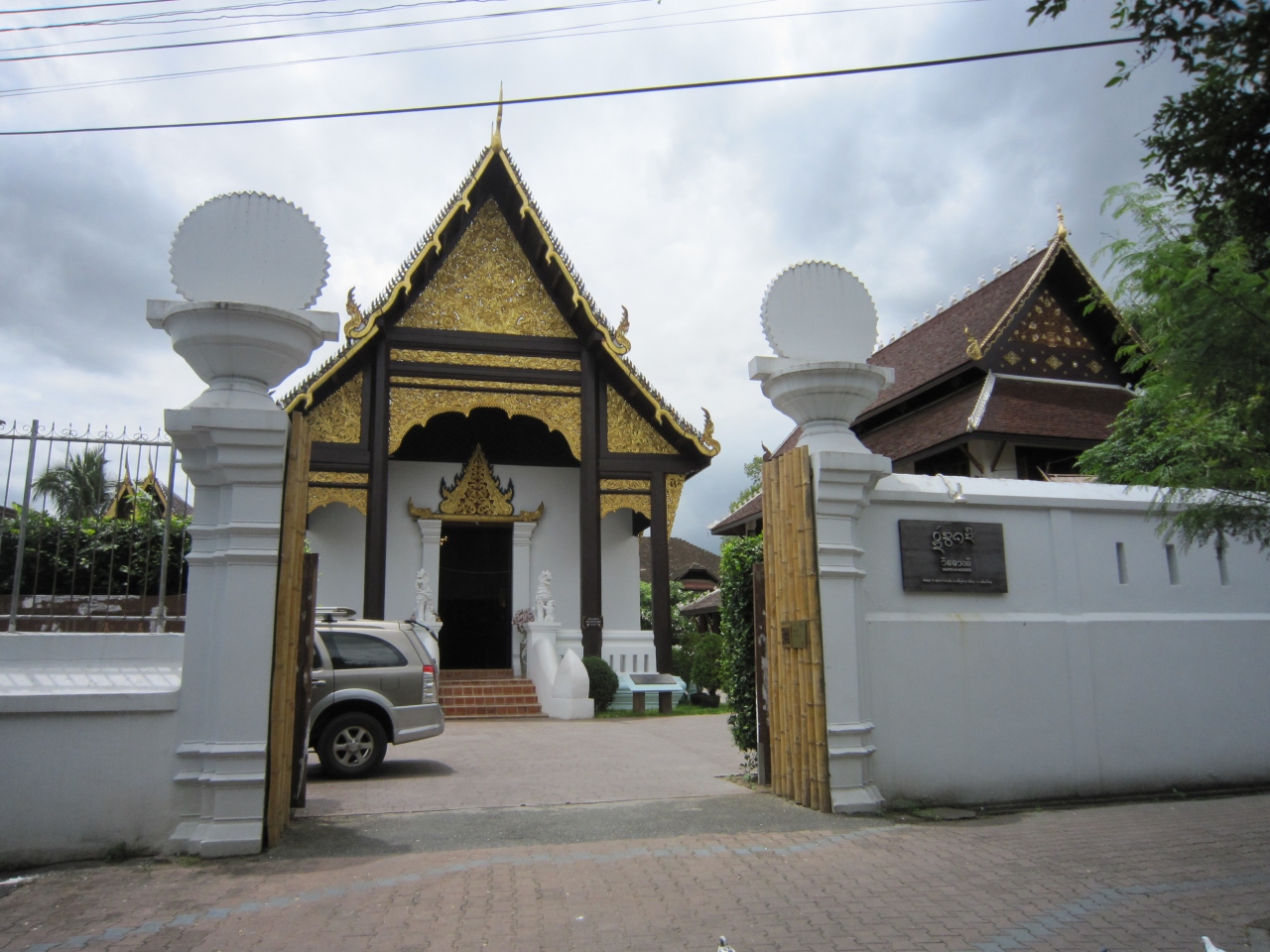3人の王様像に行く手前の商店街の小道を入ります。またはWat Umon Mahatherachanの裏門から約50m、こちらが正門のような感じで寺名表示板があり門を入ると直ぐに礼拝堂、左側に四角のお堂、礼拝堂の左奥に本堂があります。そして、礼拝堂の右横を行くと礼拝堂の後ろに白い仏塔、そして礼拝所、売店等があります。敷地は広くないですが、白が映える綺麗なお寺です。3人の王様像方面からお参りに来る人が多いようです。このお寺は「運が良い」という意味だそうで開運グッツがいろいろあるようです。そのためか新車のお祓いをしていました。また、サンデーマーケットの日にはお寺の近くに露店が並ぶためお寺をライトアップしていました。