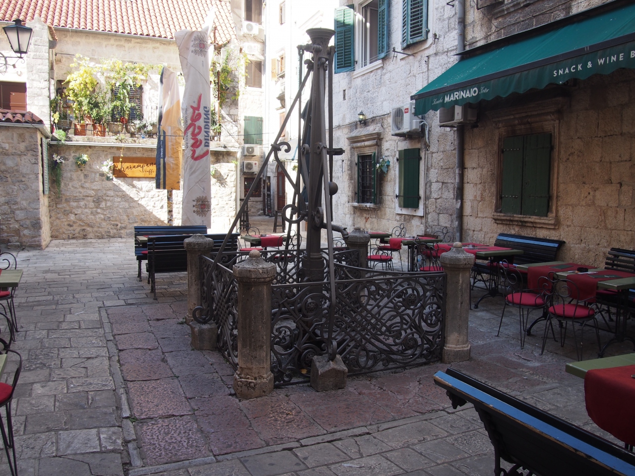 スヴェタ・二コル広場や海洋博物館などの山側を歩いているときに見つけた井戸です。カフェの横の場所のテラスの傘の下付近に井戸がありました。写真を撮っていると、店員が説明してくれました。コトルの山の湧水があるので、海に近い場所ですが、井戸を掘ると真水が出る可能性もあるのでしょう。