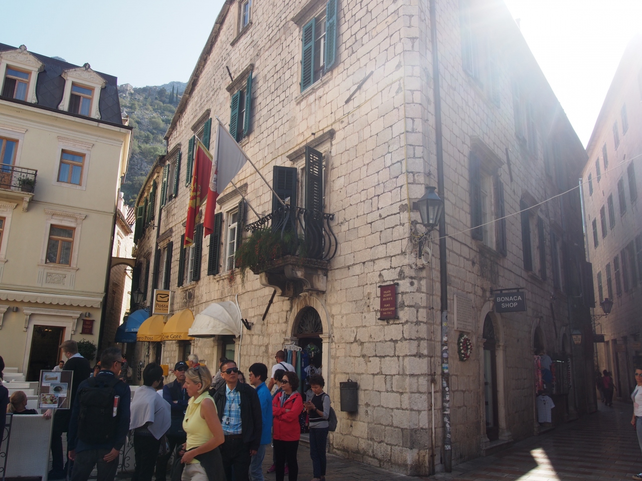 コトル旧市街内の時計塔と聖トリプン大聖堂のあいだにあるプラスナ広場に面してあります。ベネチア人の有力者、豪商の邸宅です。3階建てのシンプルな外観の建物で、歴史的建造物ということで、モンテネグロの旗などが立っているのでわかりやすいです。この付近は有力者などの邸宅が並ぶお屋敷街という感じでしょうか、広場の向かいにはピマの館もあります。