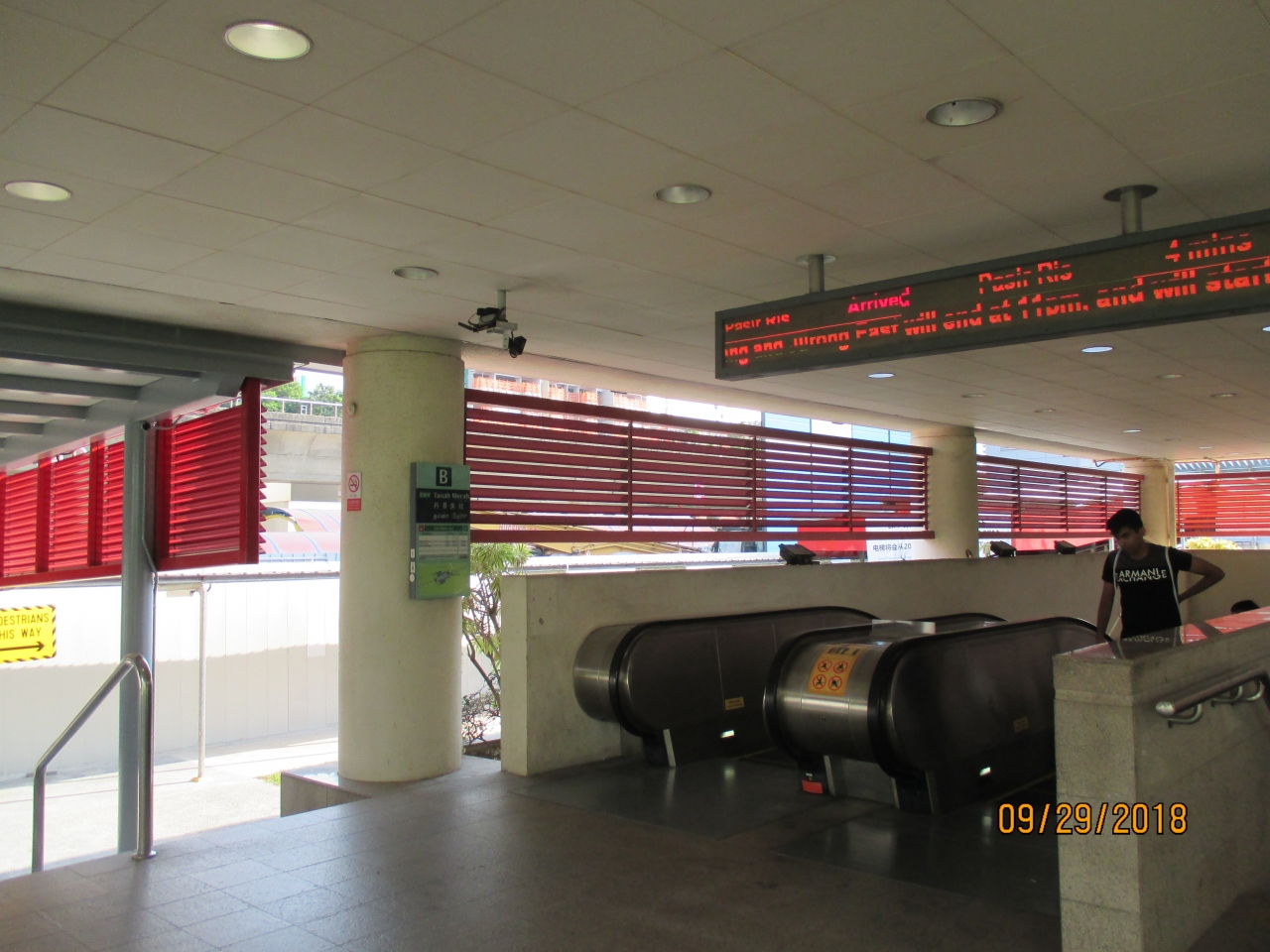 チャンギエアポート駅から2駅目、ここでは、MRTは地上に出て高架駅になっています。ホームから改札のある1階に、さらに地下に降りて、バス道路の下を通って反対側に出ます。エスカレーターで上がって外に出ると、バス停は目の前に見えました。
